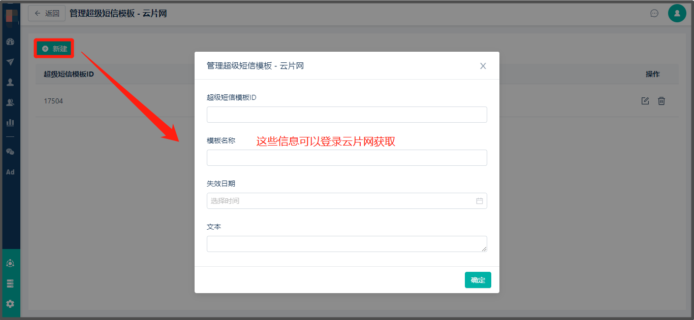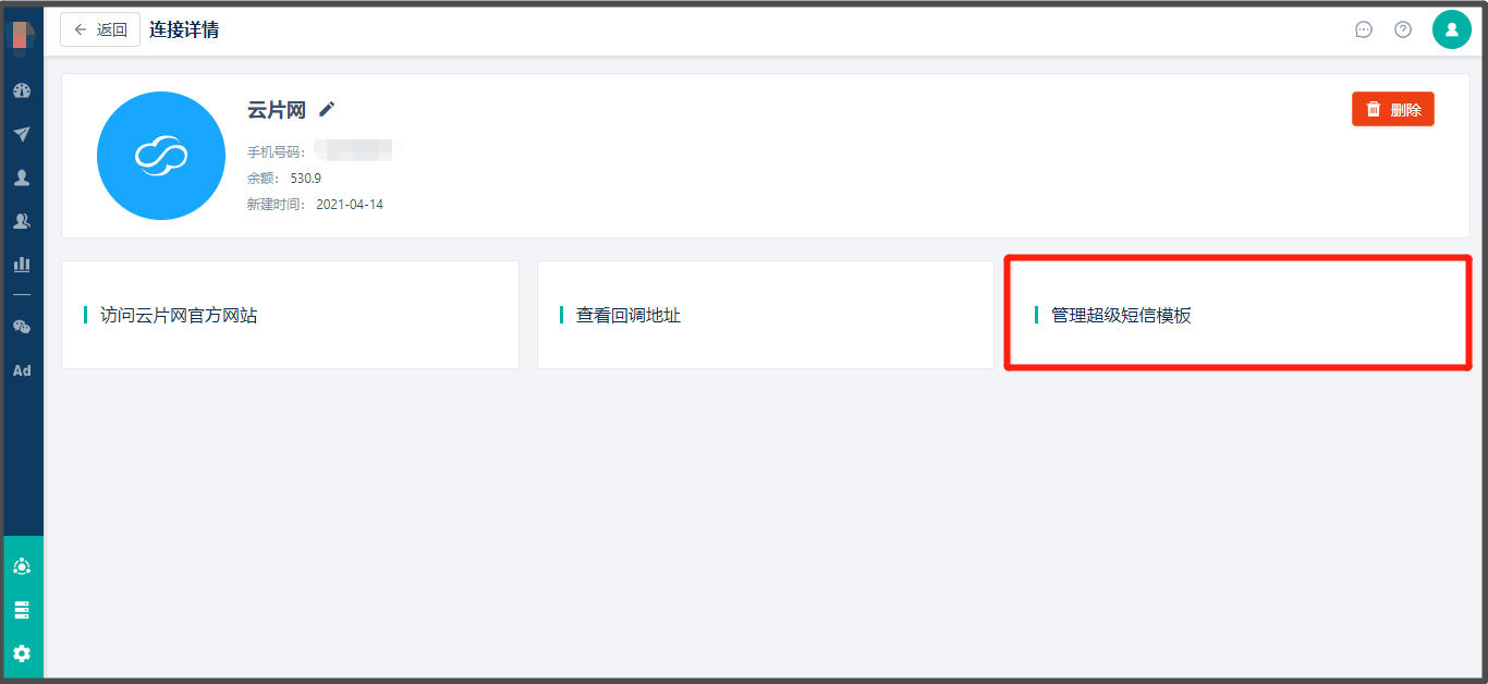 * 路径:【连接管理】> 点击已对接的【云片网】> 【管理超级短信模板】