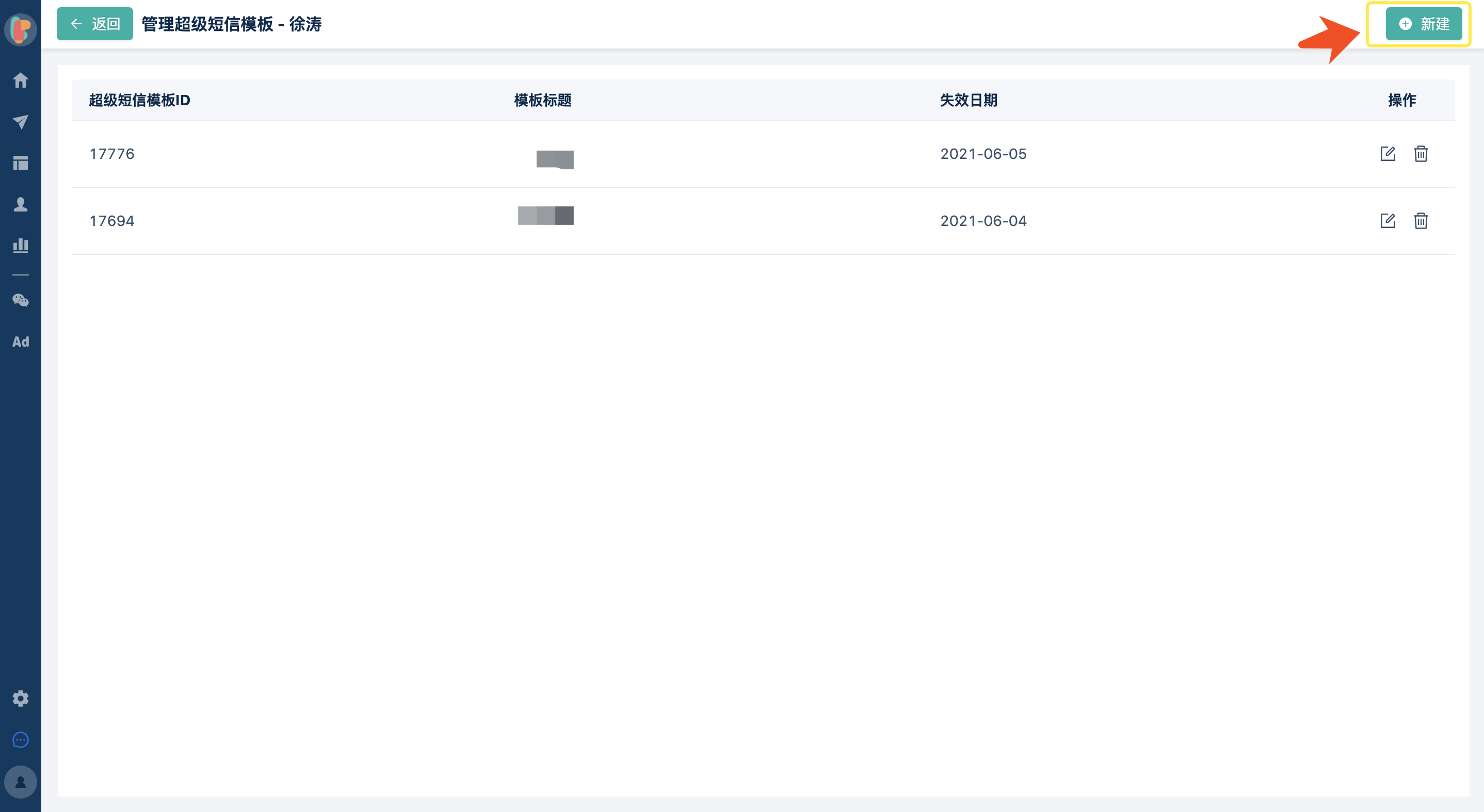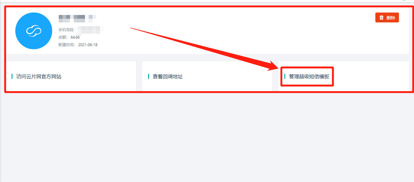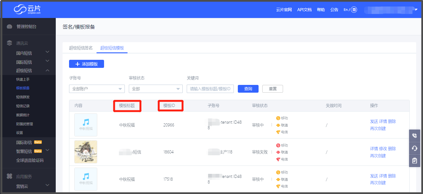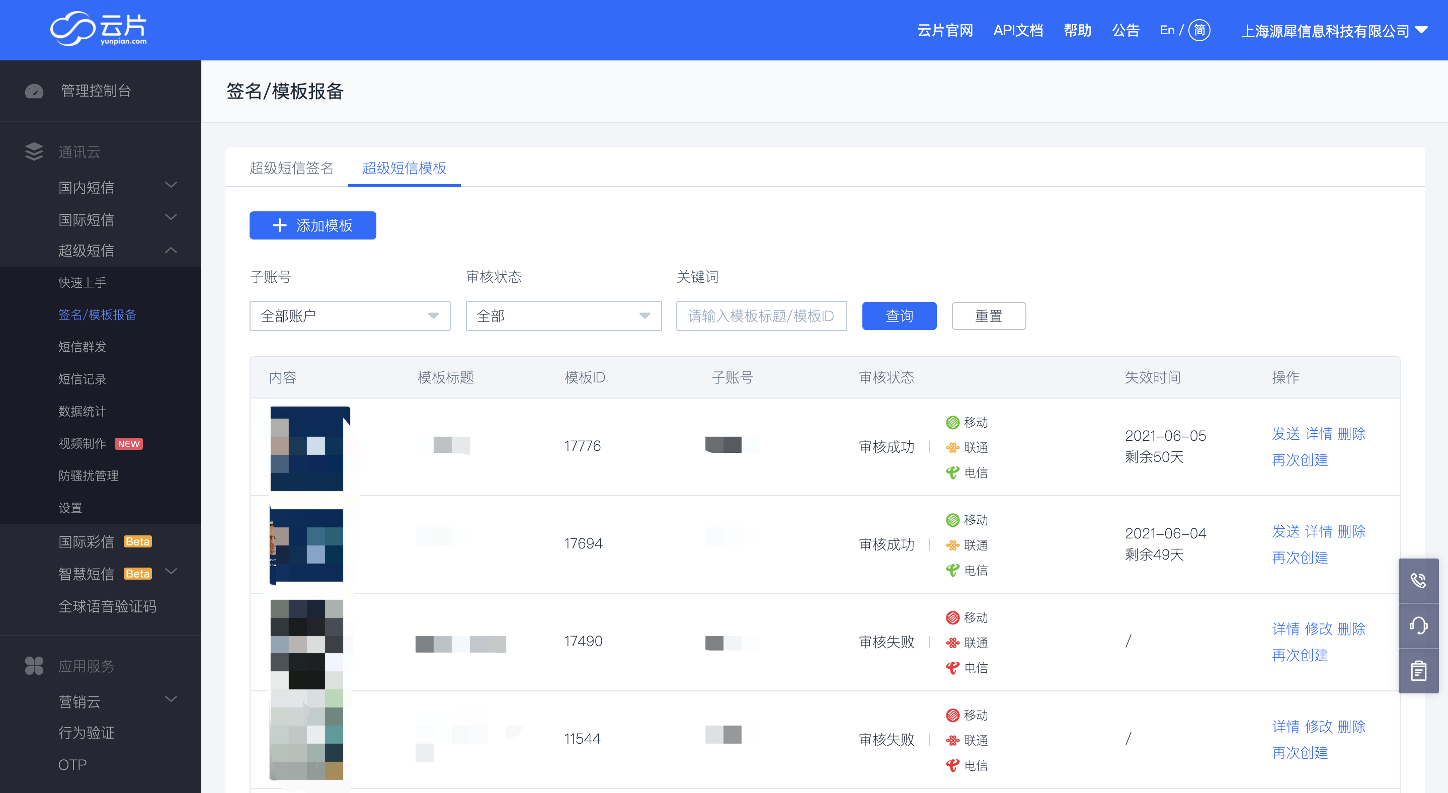 路径:【连接管理】> 【云片网】> 【管理超级短信模板】