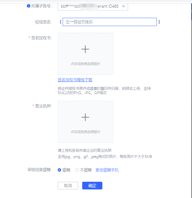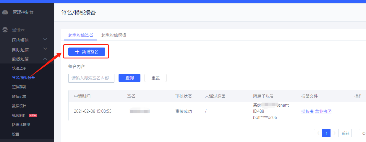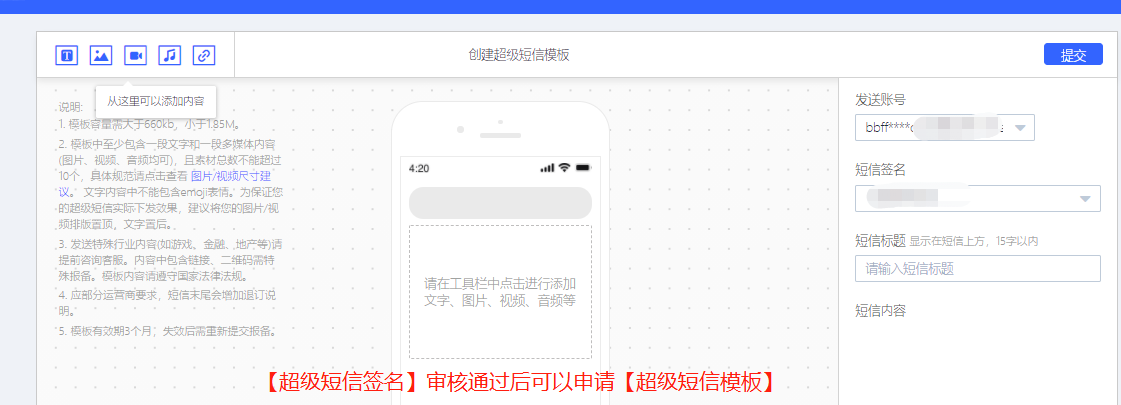 * 注:【超级短信签名】通过后才能申请【超级短信模板】
