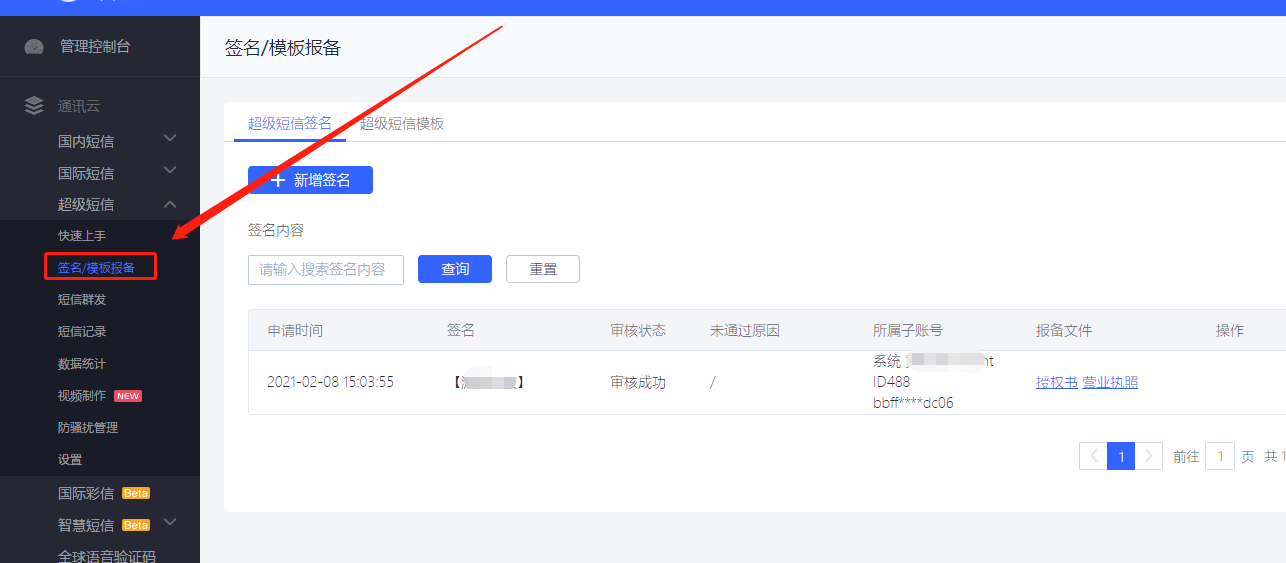 2. 依次完成【超级短信签名】与【超级短信模板】的创建。