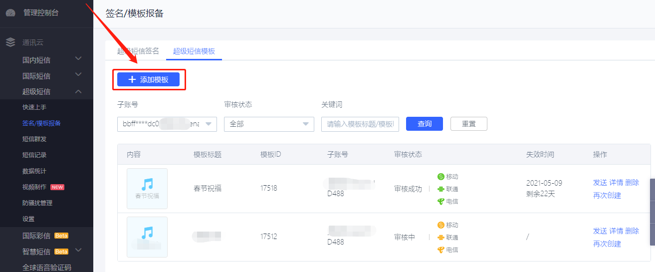 3. 因运营商是三网分别审核,所以存在某一个模板仅能对移动用户发送,不能对联通用户和电信用户发送的情况。