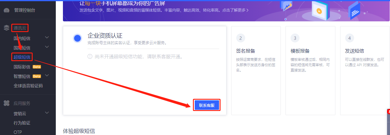 * 创建路径:登录[云片网](https://www.yunpian.com/entry)(已完成“企业资质认证”,未完成认证无法开通超级短信) > 【通讯云】> 【超级短信】> 【联系客服】进行开通