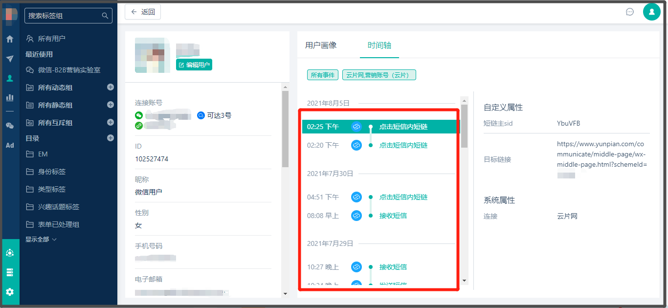 * 事件查询路径:【用户和标签】> 点击用户并打开 > 点击【时间轴】可以查看到云片网的相关事件,如下图: