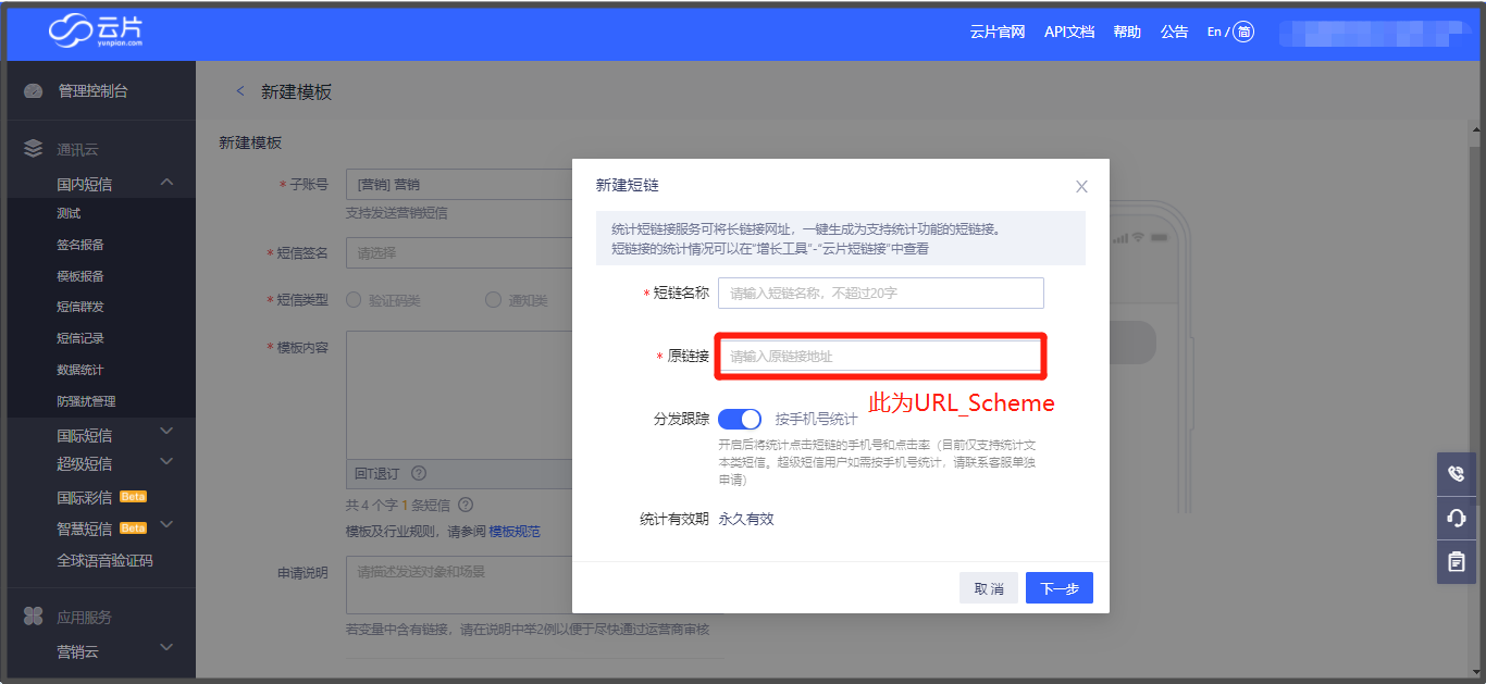 ## 将“URL scheme”添加到云片网的短信模板中