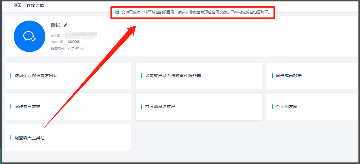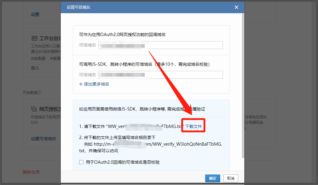 * 在企业微信弹框中点击【申请校验域名】链接,【下载文件】并上传到Linkflow弹框。