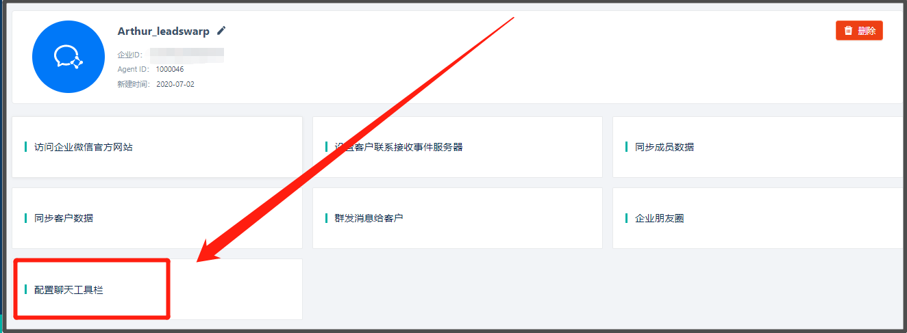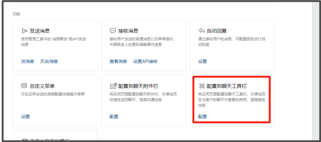 路径:登录企业微信后台【应用管理】> 选择【自建应用】(已经与Linkflow对接的企业微信应用)>在【功能】中找到【配置到聊天工具栏】
