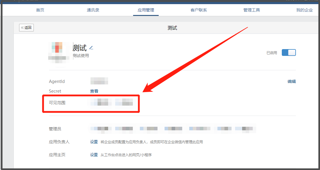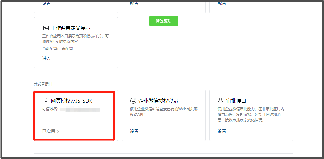 点击【确定】后,企业微信自建应用菜单【网页授权及JS-SDK】会显示为【已启用】: