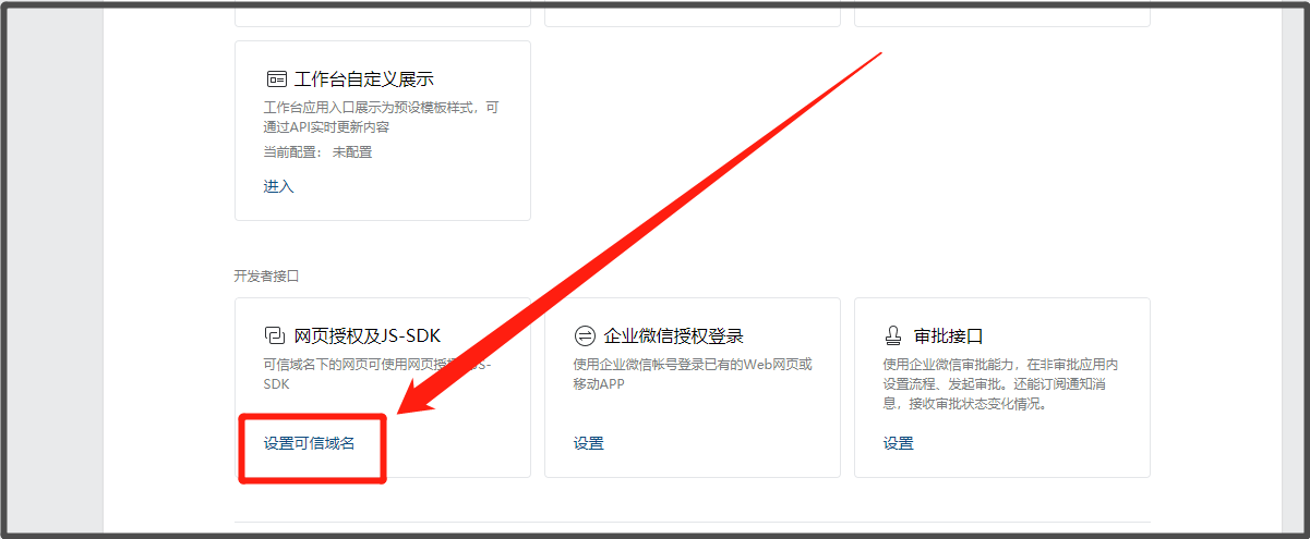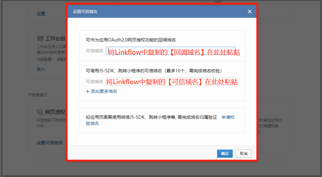 * 同时登录企业微信后台【应用管理】> 选择【自建应用】(已经与Linkflow对接的企业微信应用)> 点击菜单【网页授权及JS-SDK】。将Linkflow的【回调域名】、【可信域名】复制到企业微信