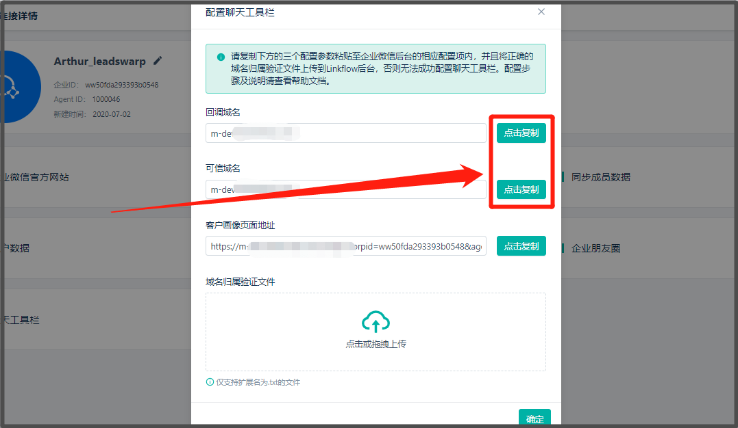* 路径:【连接管理】> 点击已与Linkflow连接的【企业微信】> 【配置聊天工具栏】> 提前复制【回调域名】&【可信域名】到文本或其他文件