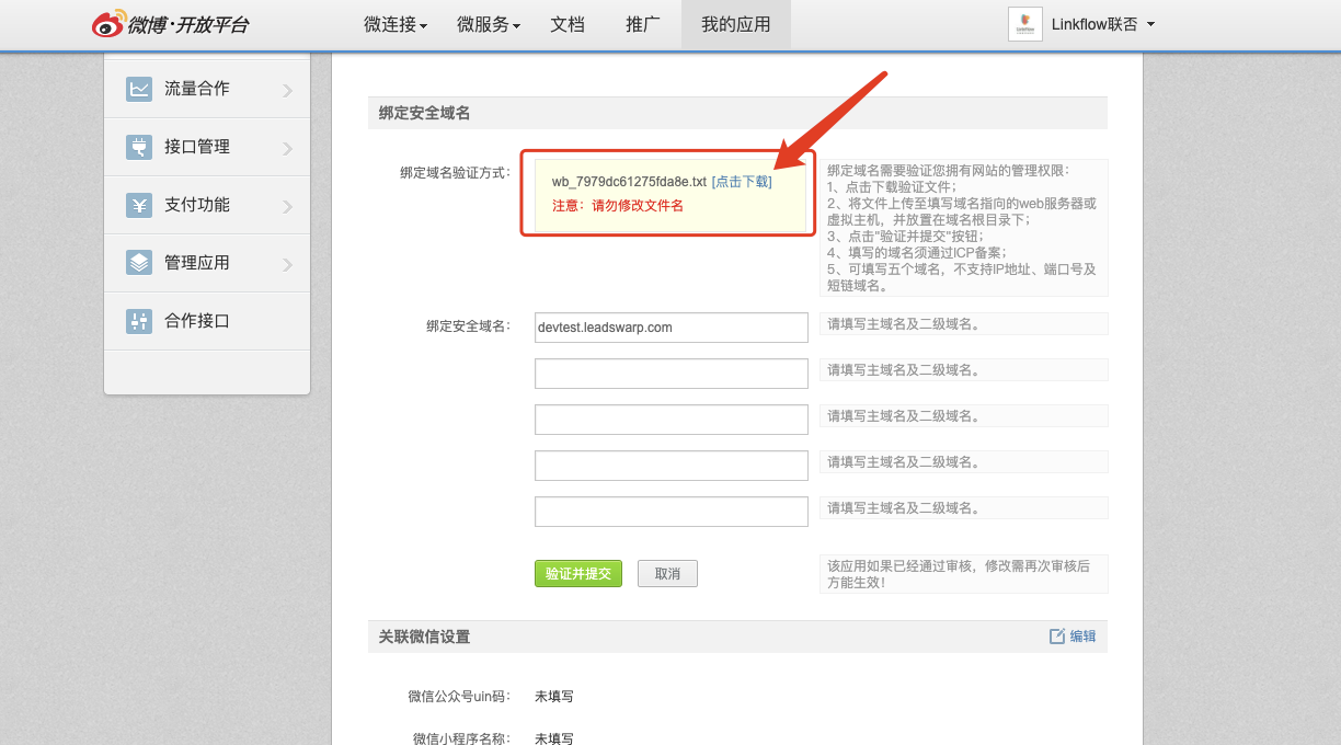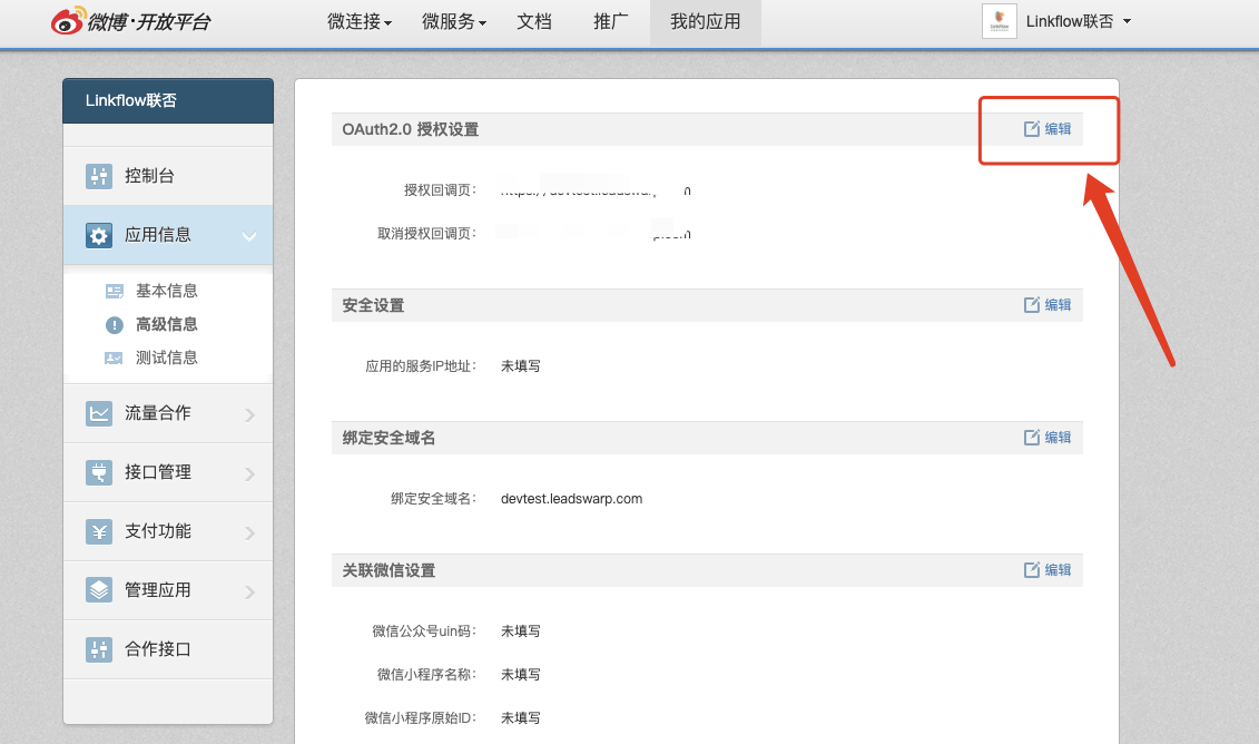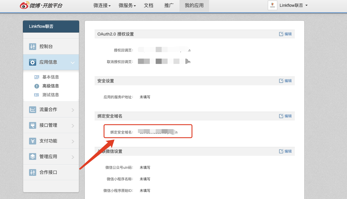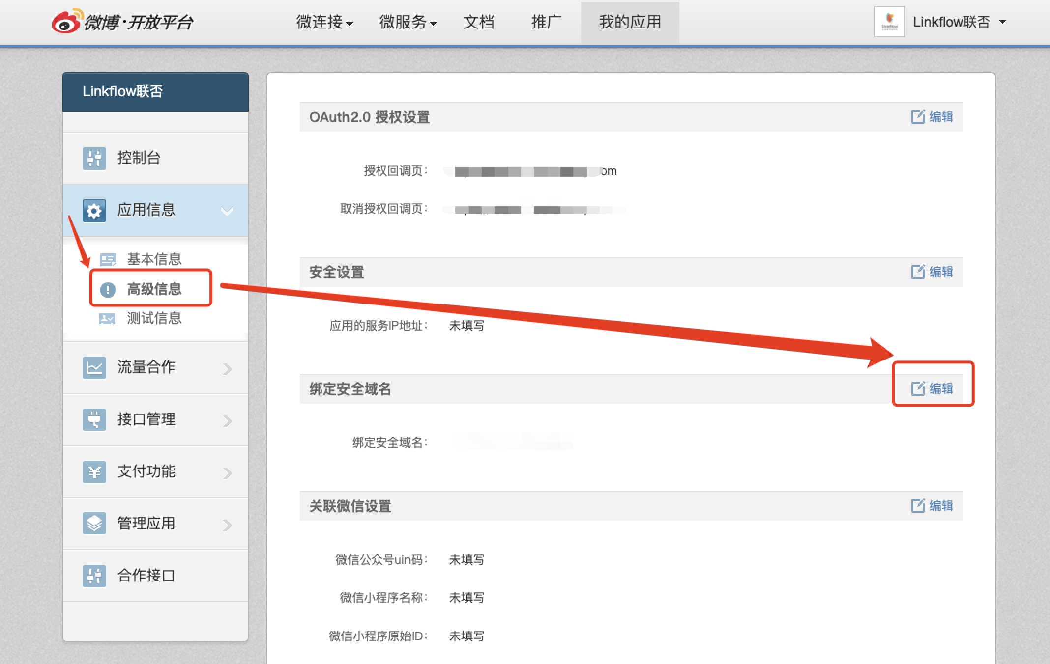 2、进入[微博开发平台](https://open.weibo.com/),找到需要与Linkflow连接的应用,点击应用信息-高级设置,需要绑定安全域名。点击绑定安全域名内的“编辑“按钮,下载域名校验文件。