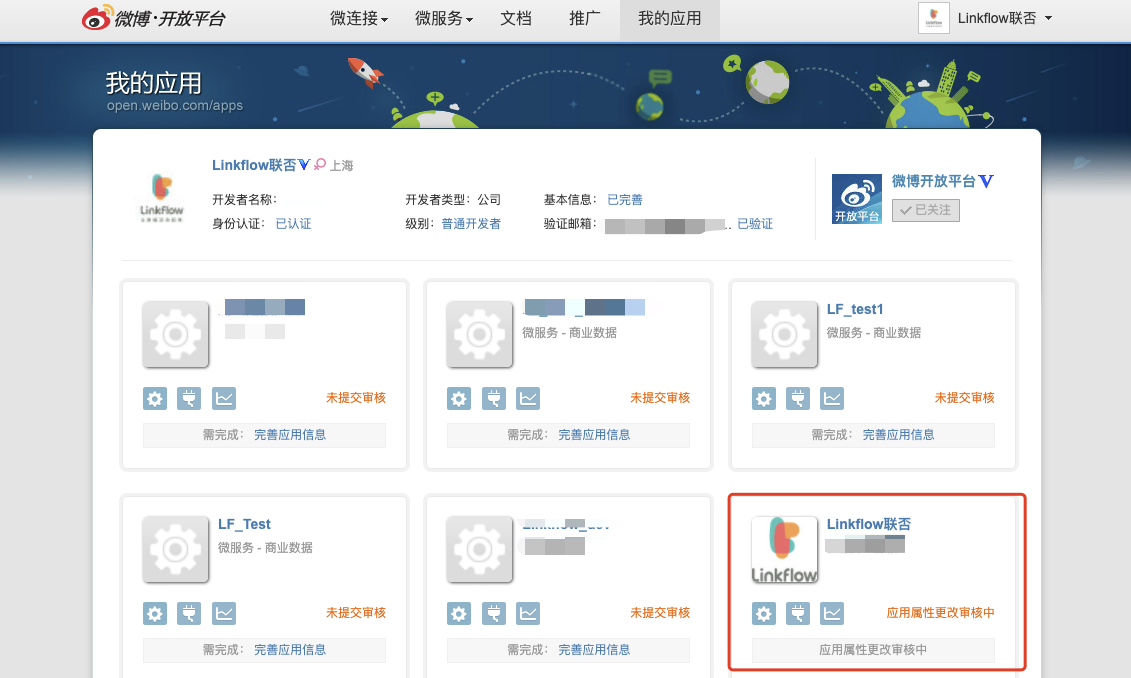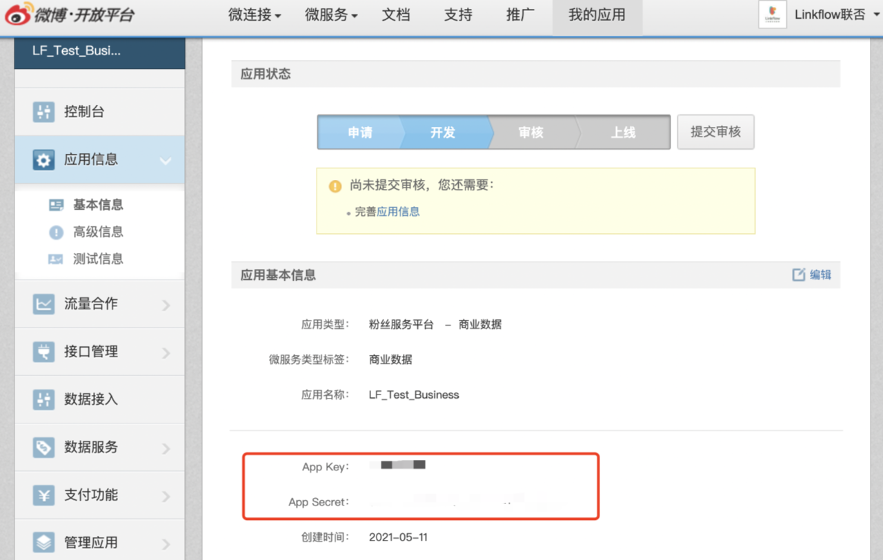 注意:应用需填写信息提交审核,以免连接应用失败。