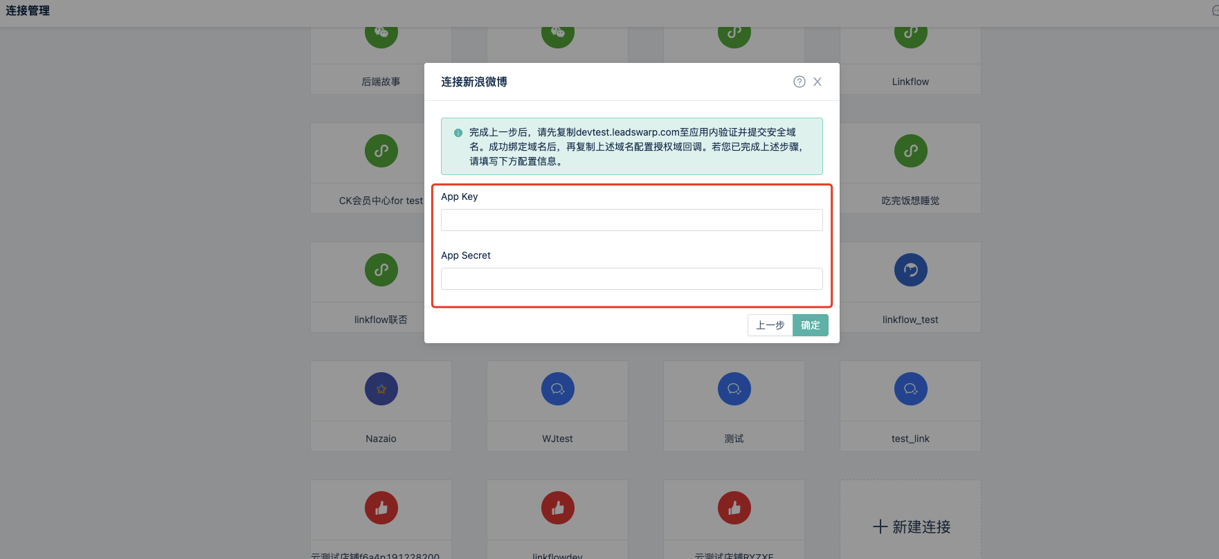 1、在Linkflow系统内,点击【连接管理】-【新建连接】,在出现的弹窗中点击【社交媒体】-【微博】,阅读完连接说明后点击“确定“按钮,进入连接微博的配置界面。