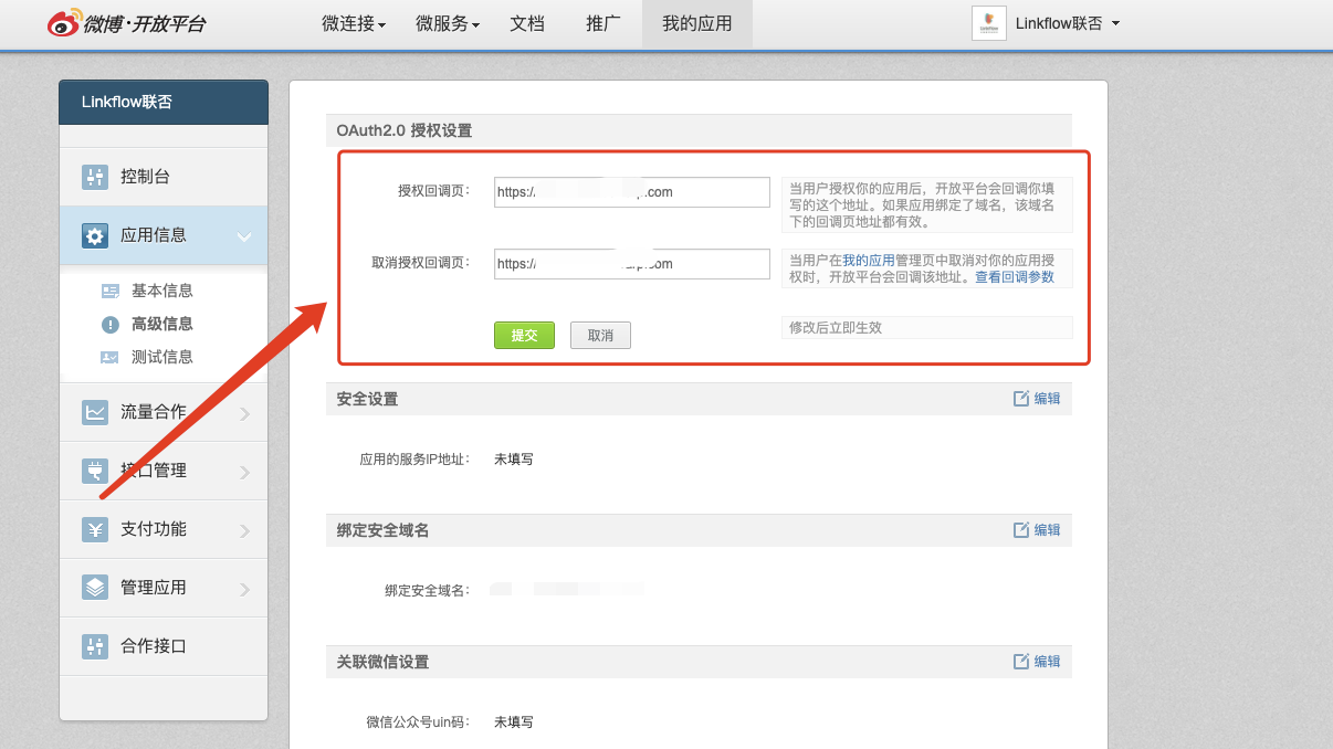 授权回调页和取消授权回调页均输入:https://+LF内复制的域名。输入完成后点击提交。