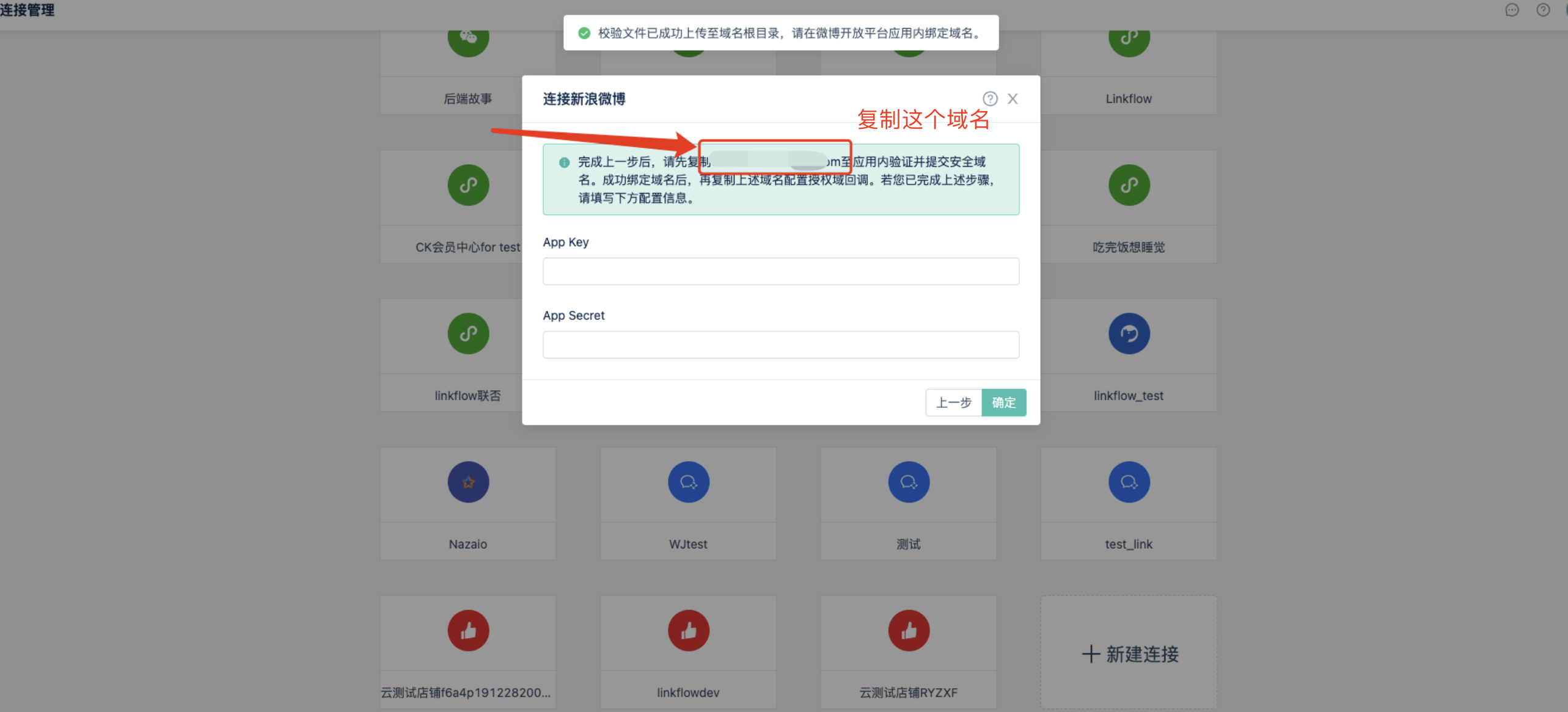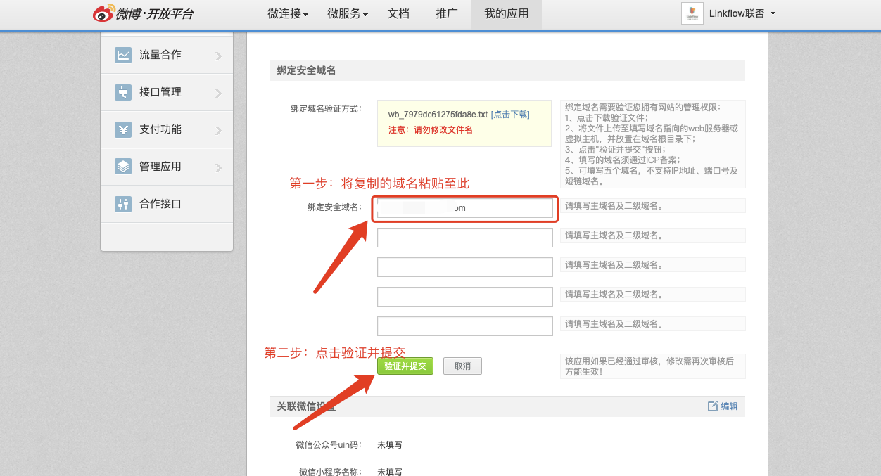 4、先在连接微博的下一步弹窗内复制域名。然后回到微博的应用内粘贴域名并提交。安全域名右方有显示在Linkflow内复制的域名,即表示域名绑定成功。