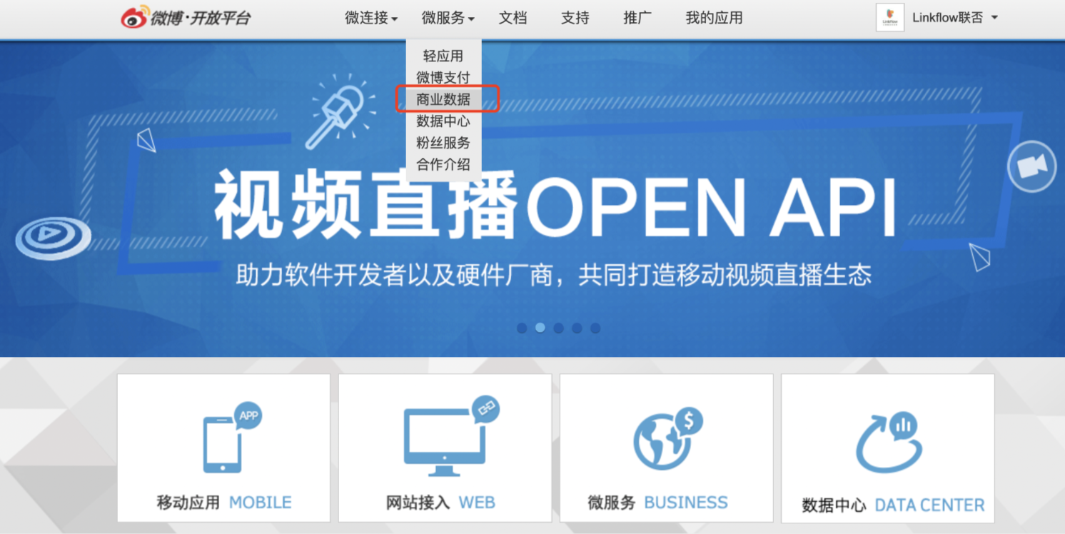 1、进入到[微博开发平台](https://open.weibo.com/),点击微服务-商业数据,创建商业应用