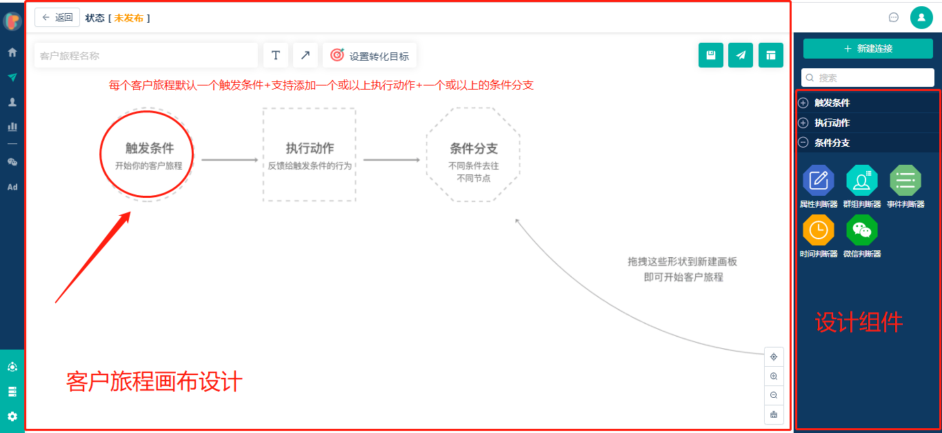 ——客户旅程设计采用了可视化的操作界面,通过拖拽组件完成流程设计。