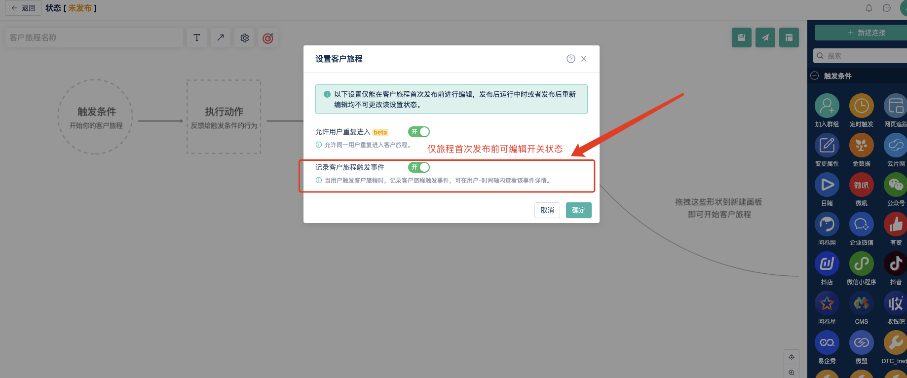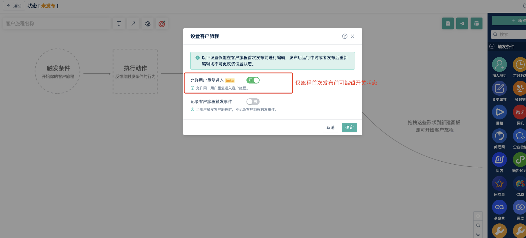 **注意: 开关状态仅能在客户旅程首次发布前进行更改,发布后运行中时或者发布后重新编辑均不可更改该开关状态。**