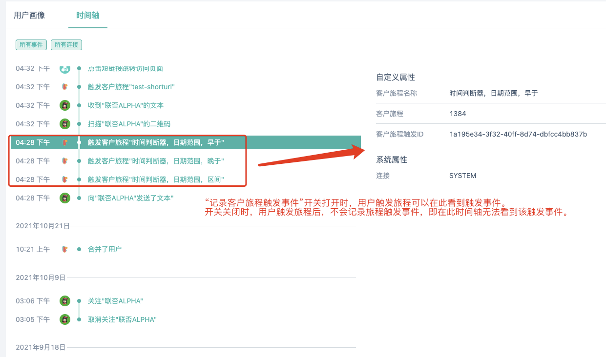 * 打开:当用户触发客户旅程时,记录客户旅程触发事件,可在用户-时间轴内查看该事件详情。