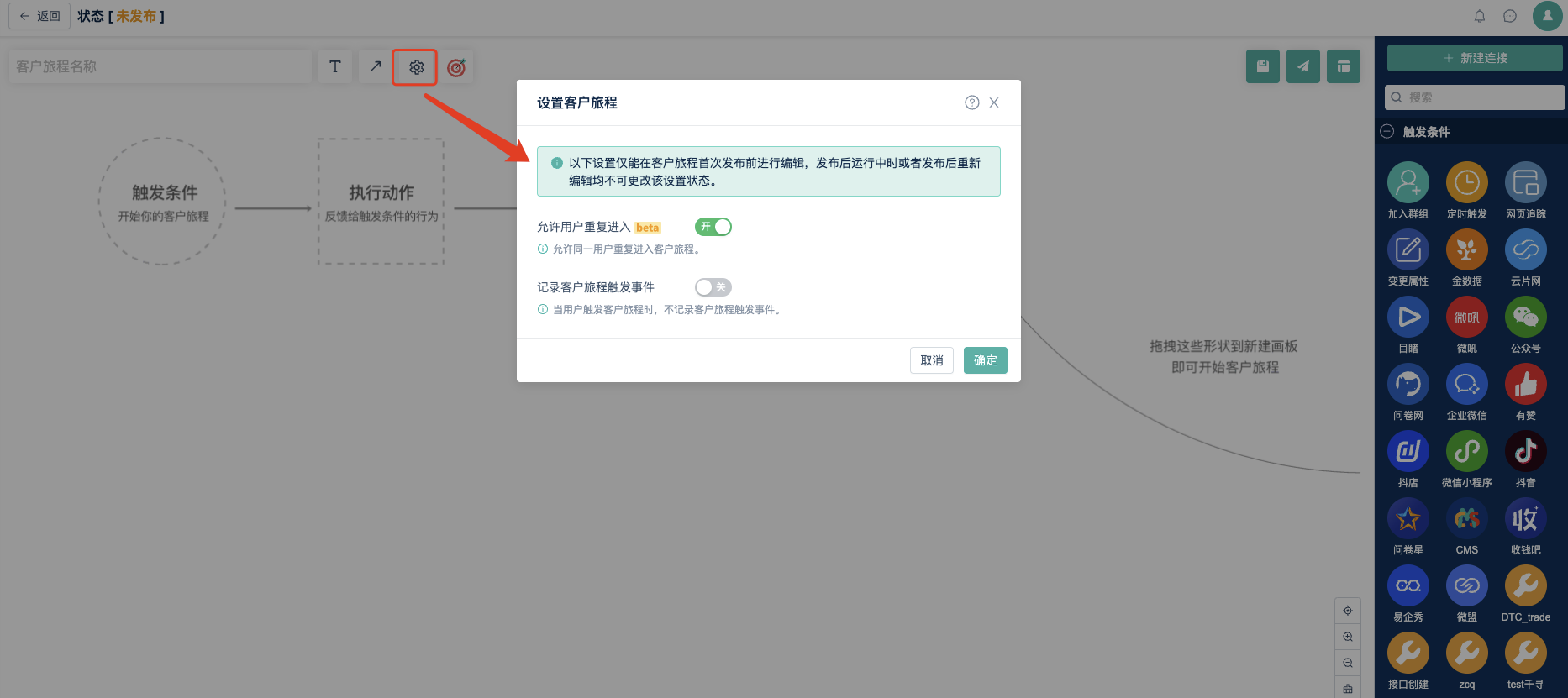 支持设置是否允许用户重复进入客户旅程和设置是否记录客户旅程触发事件。