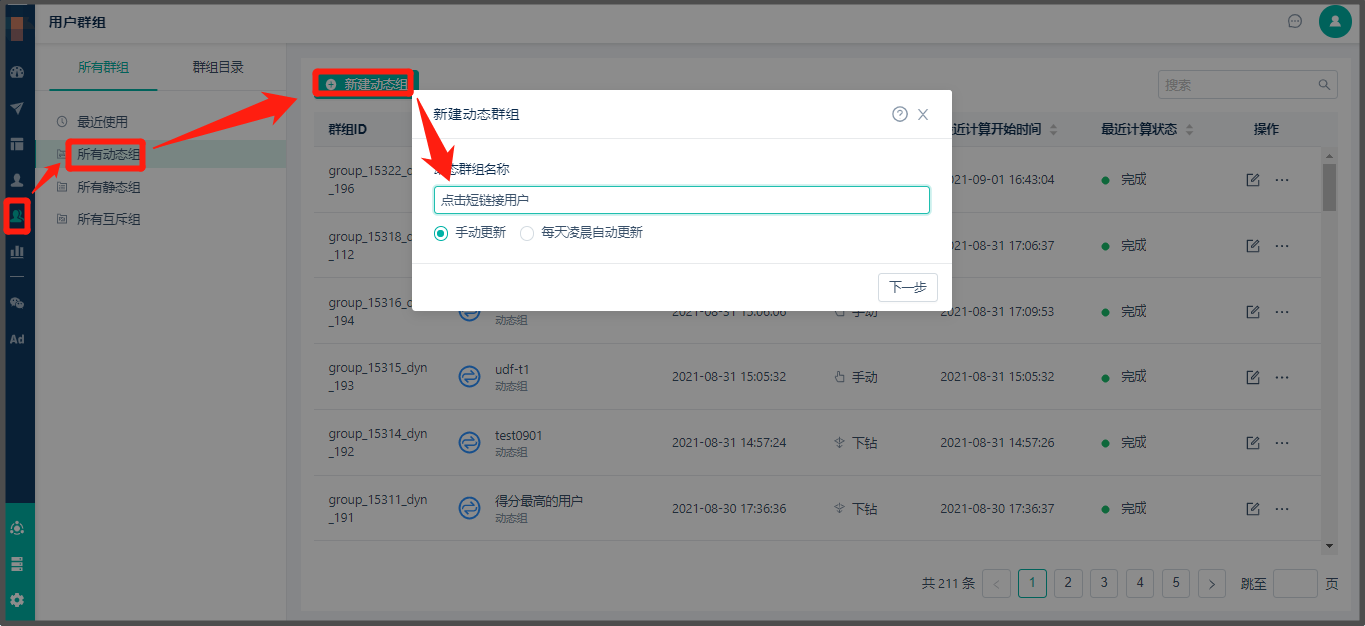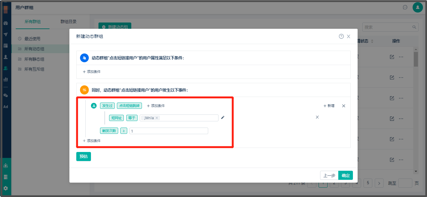 * 查找路径:【用户群组】> 点击所有动态组 >【新建动态组】> 输入筛选条件,参考下图: