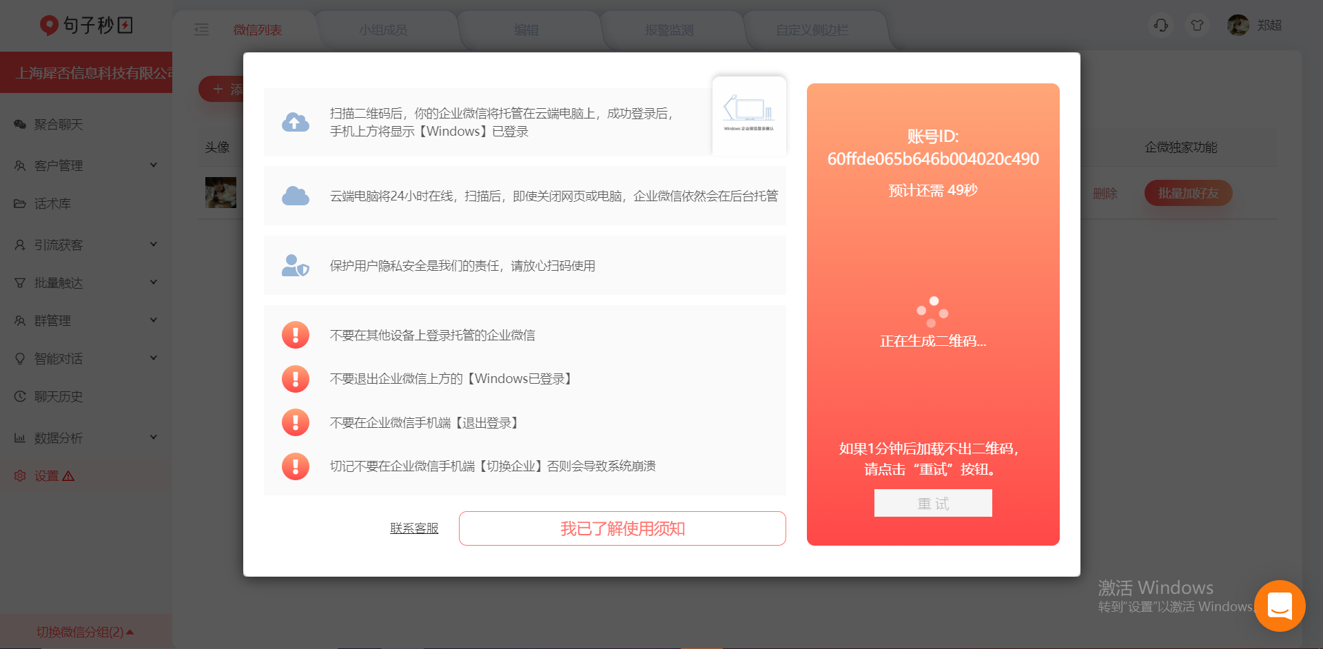 在弹出的界面中,使用要托管的企业微信账号扫描二维码。