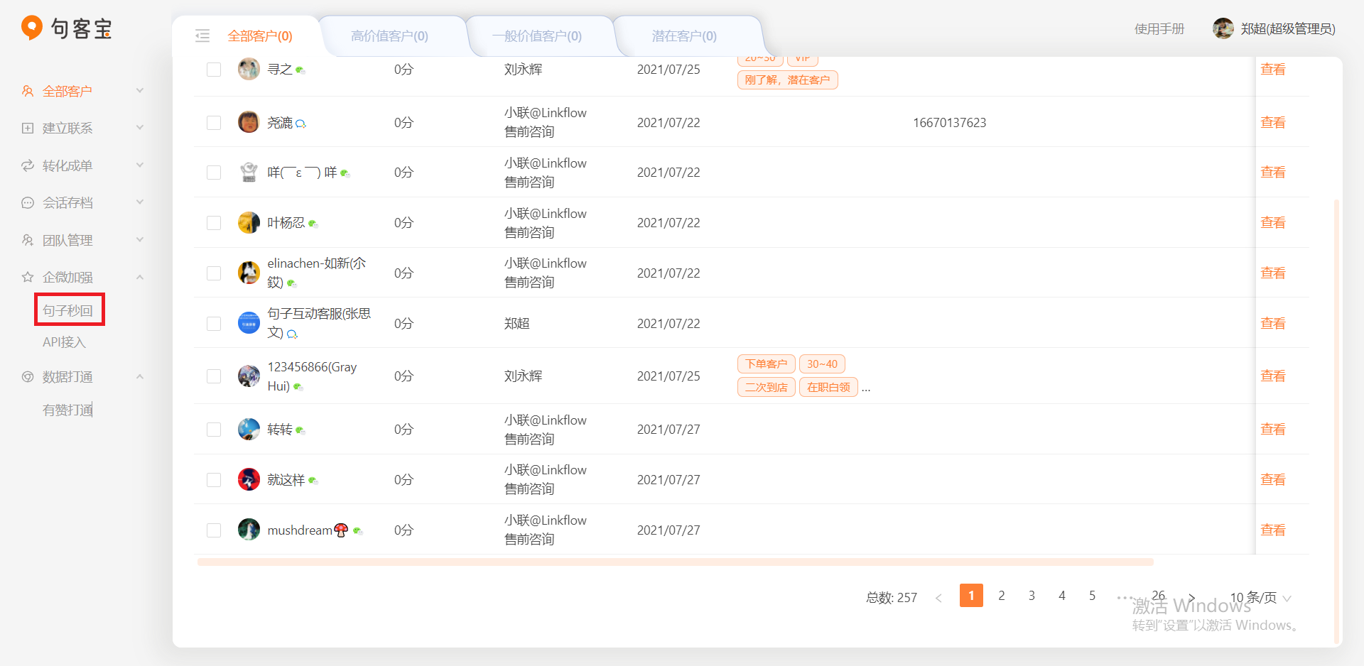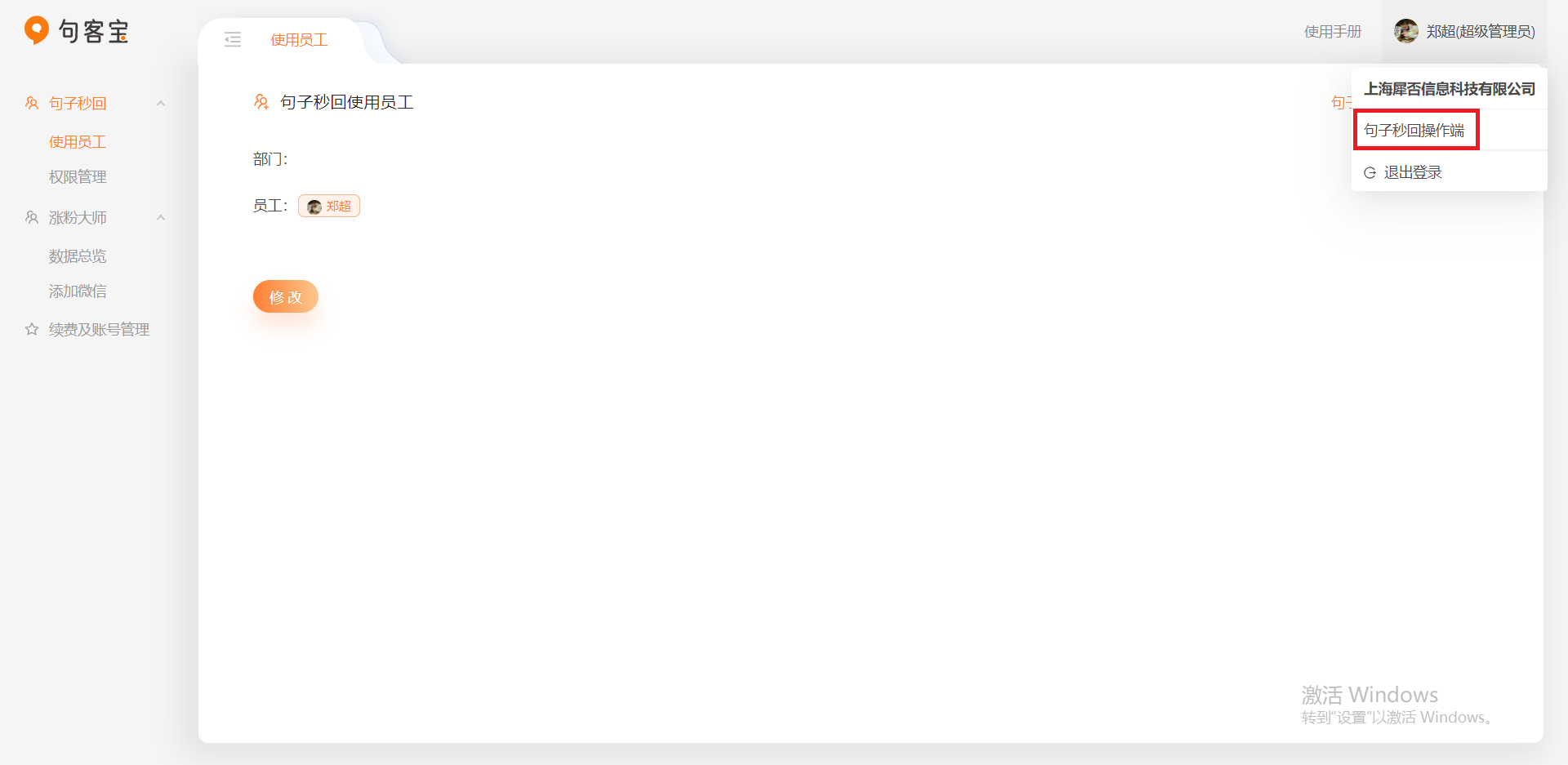 如果找不到“句子秒回”的入口,可以通过“句子互动”官网登录“句客宝”。通过“企微加强”-》“句子秒回”进入句子秒回管理端,之后通过右上角菜单切换到操作端。
