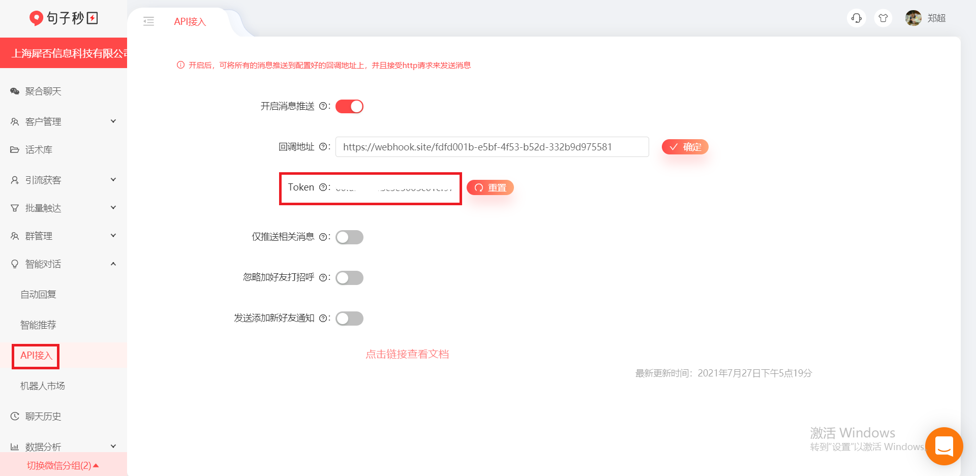 在“句子秒回”-》“智能对话”-》“API接入”中,找到token,并填入Linkflow新建连接弹框。