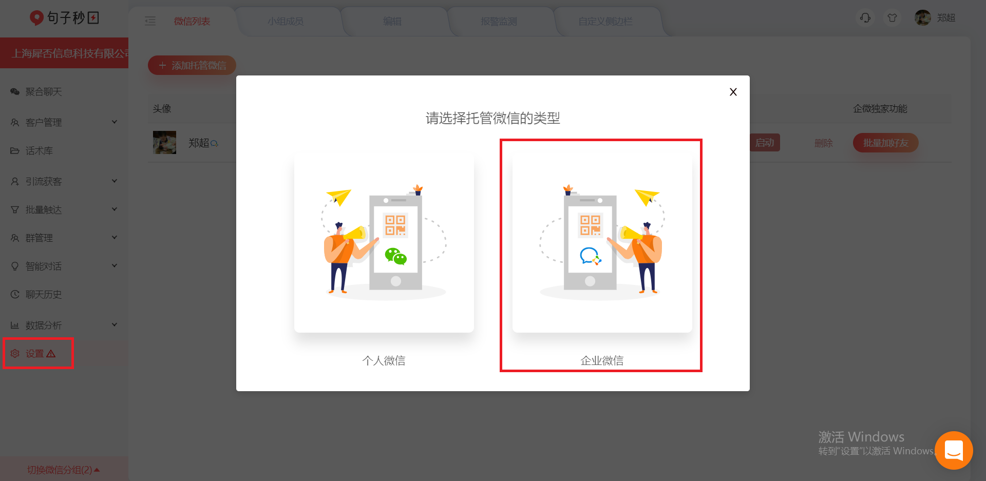 在句子秒回操作端的“设置”菜单,点击“添加托管微信”,在弹框中选择“企业微信”。