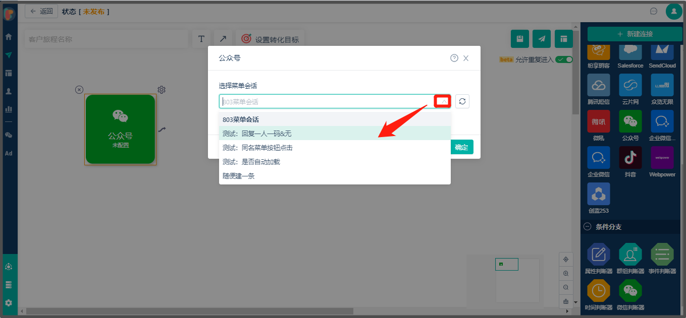 选择【发送菜单会话】的微信公众号,选择需要发送的【菜单会话】