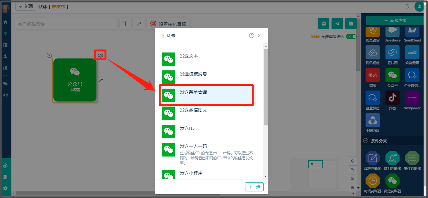 * 路径:【客户旅程】> 【新建客户旅程】> 【直接新建客户旅程】> 【执行动作】> 选择【微信公众号-执行动作】然后选择【发送菜单会话】