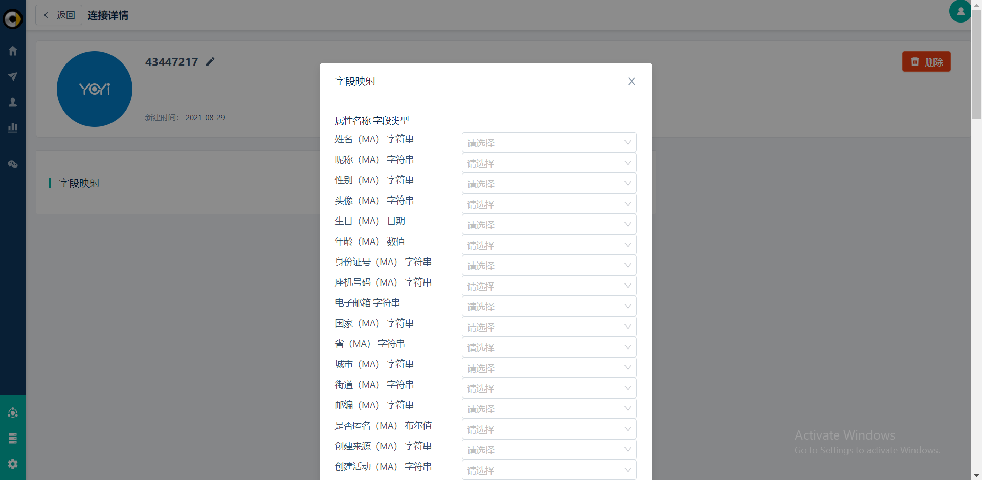 在连接菜单“字段映射”中设置,仅设置Linkflow中已有的字段。这些属性字段会被传输到Yoyi。