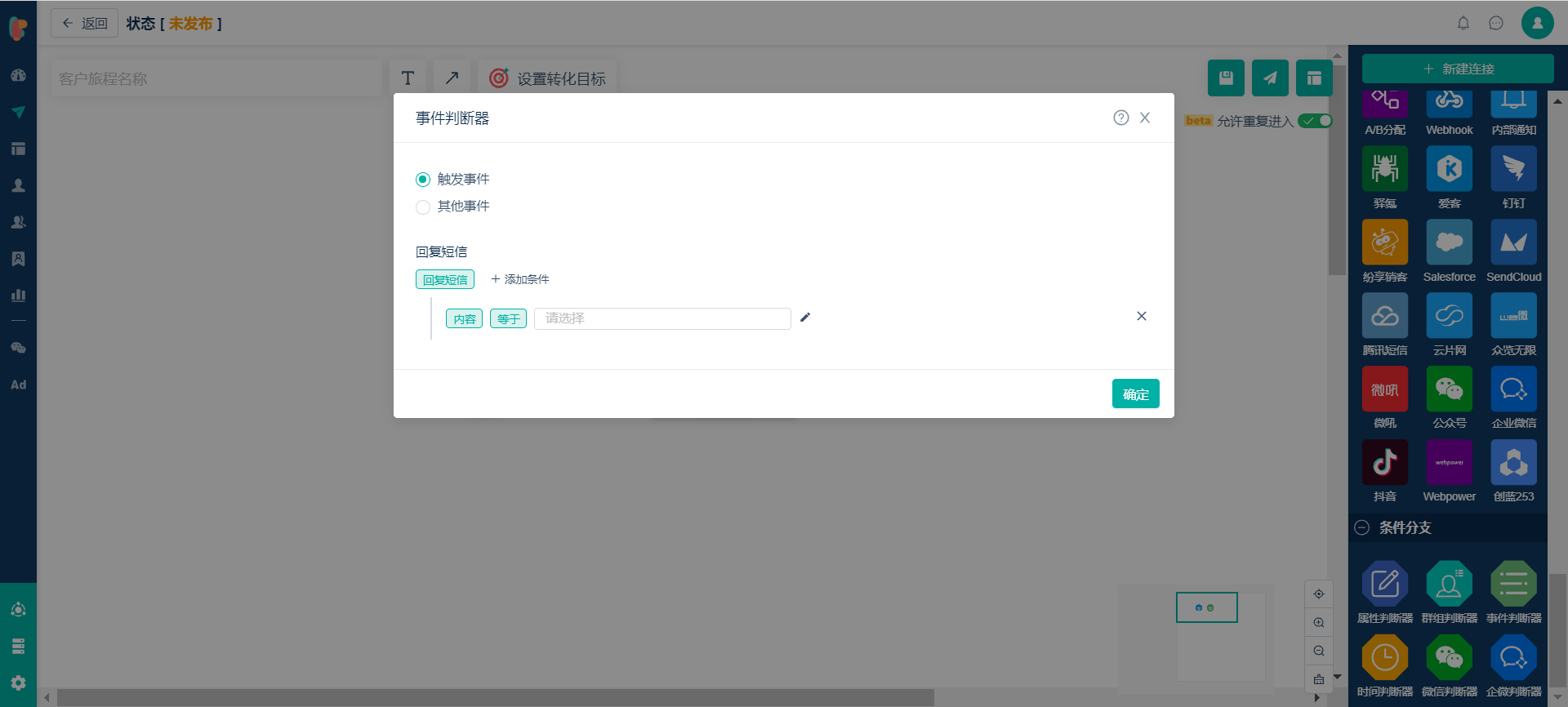1、从【客户旅程】>【新建客户旅程】>【触发条件-云片网】选择回复短信或退订短信设定触发条件