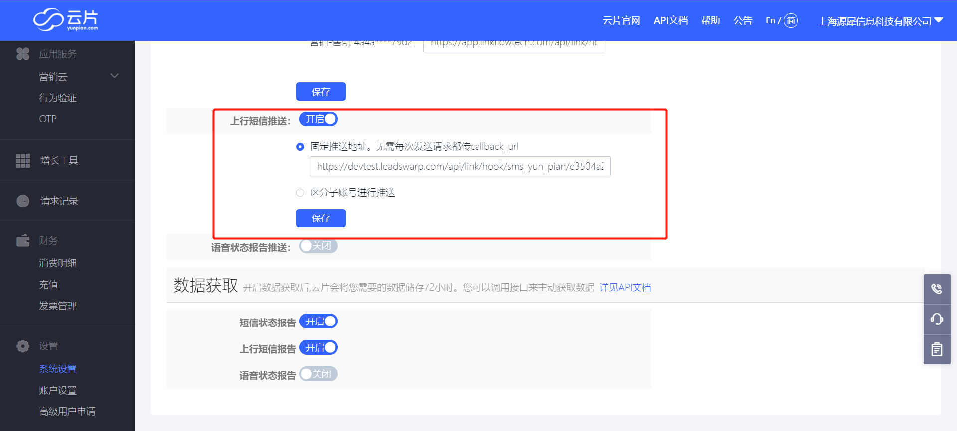 2、在云片网后台【设置】>【系统设置】>【数据推送与获取】填入回调地址
