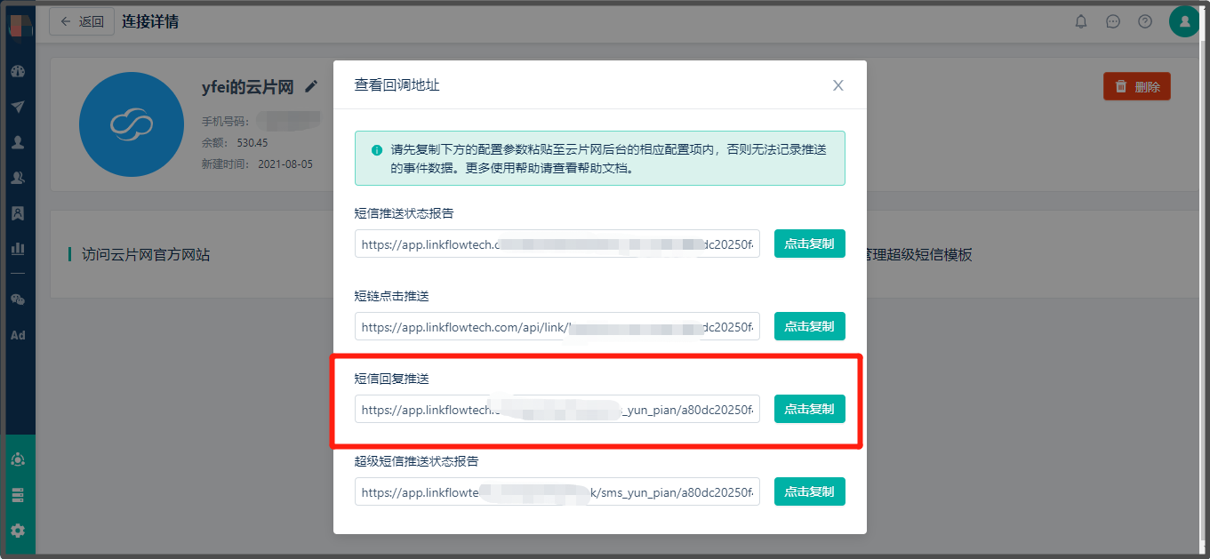 1、从【连接管理】>【云片网】>【查看回调地址】获取回调地址