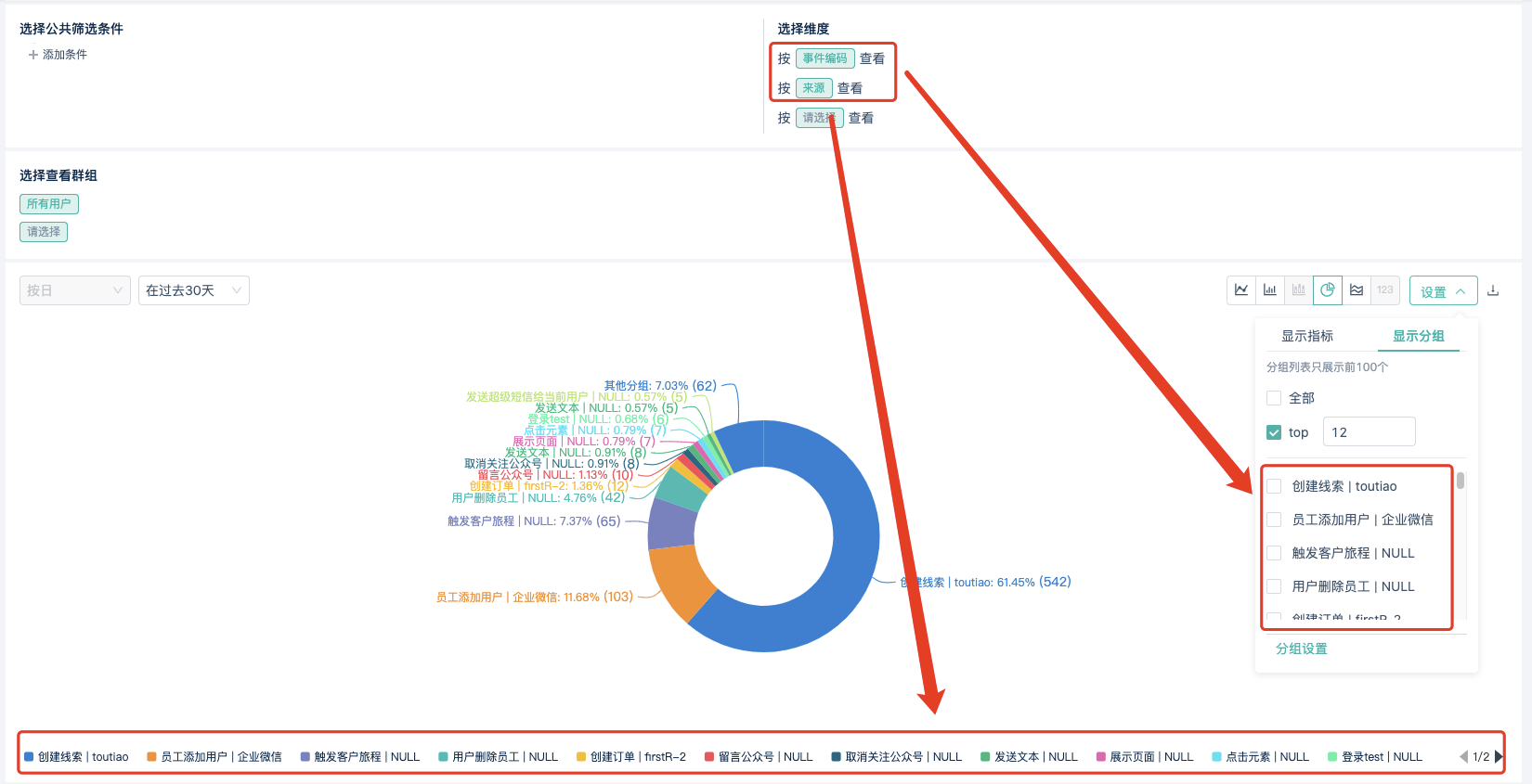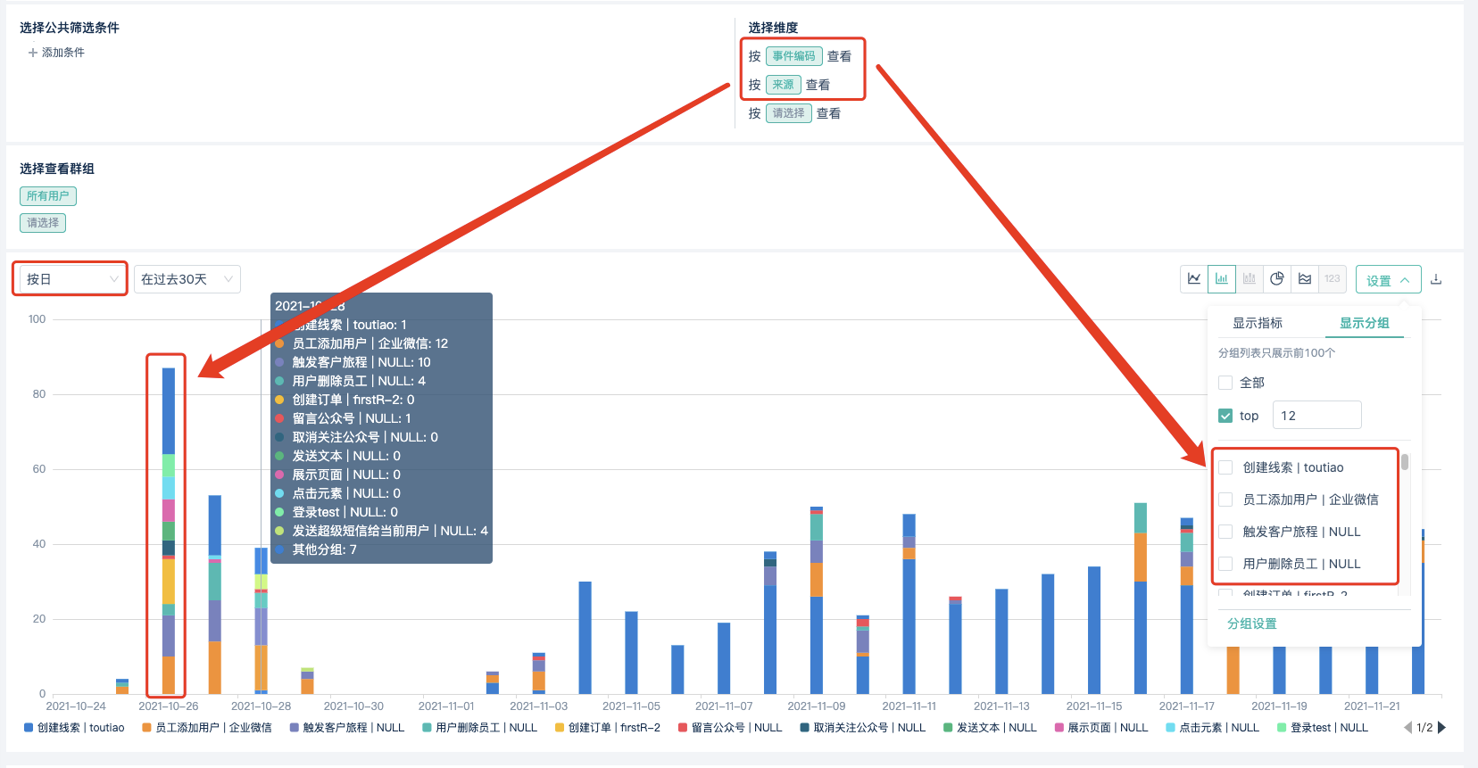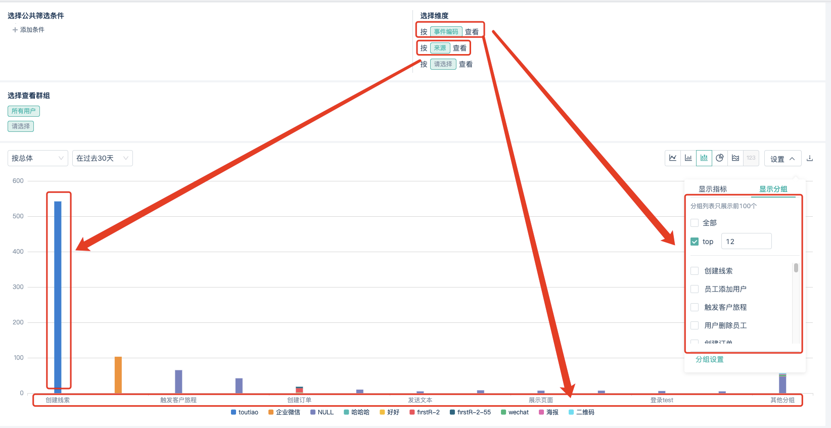* 图表和表格对堆叠维度固定展示top12+其他分组,不支持自定义勾选分组