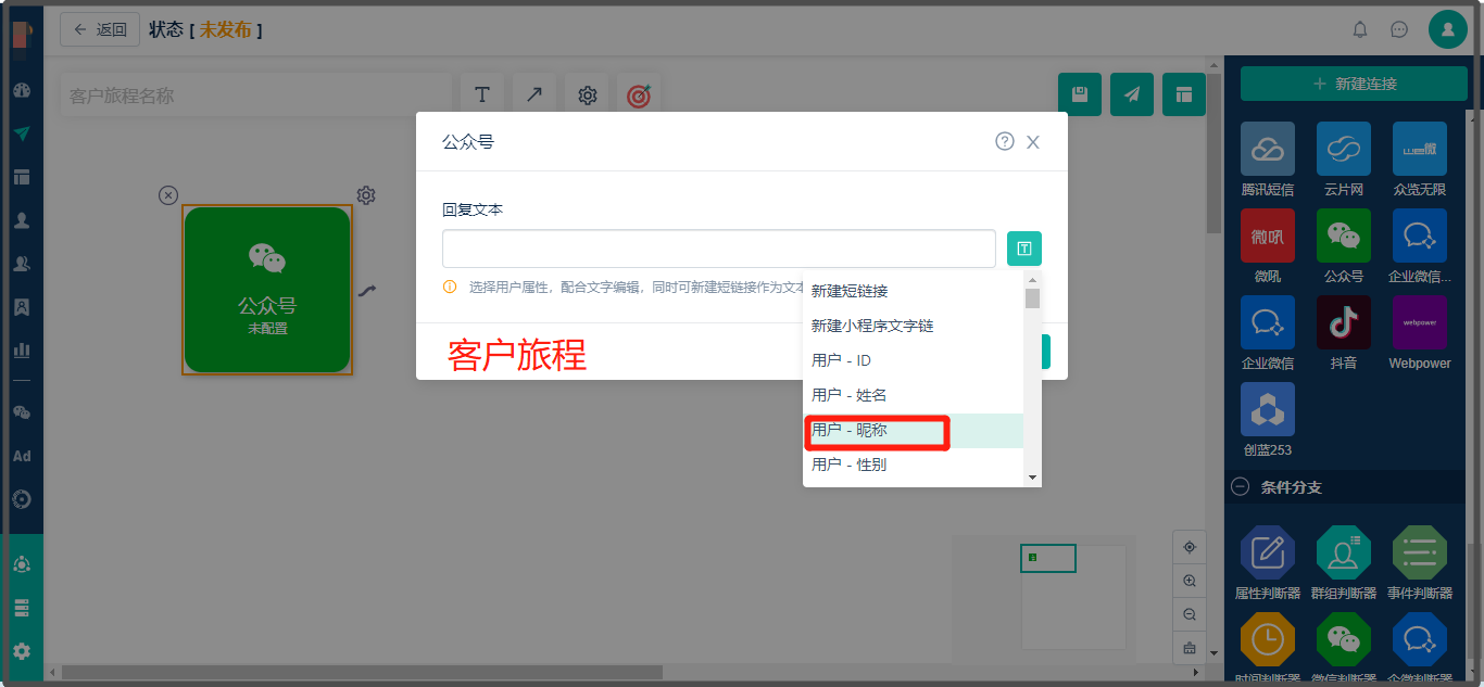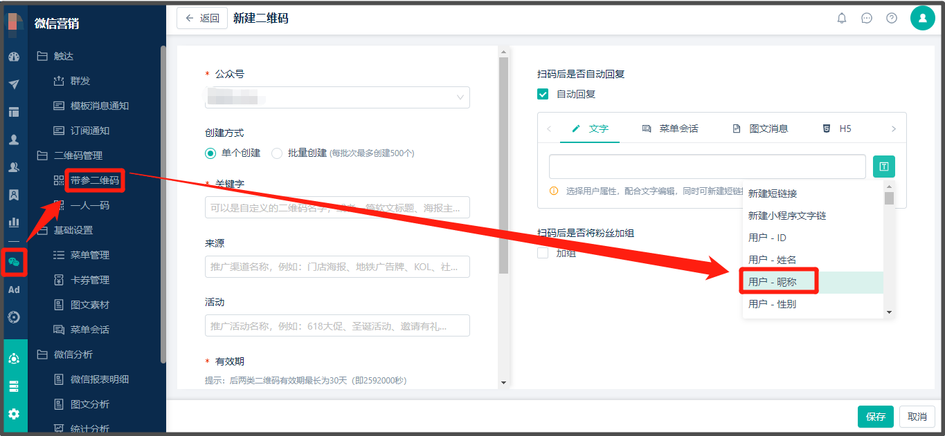 2. 【客户旅程】发送文本&模板消息、【带参二维码】生成时的文本回复中,如果使用“用户昵称”,新关注粉丝收到时显示为空值。