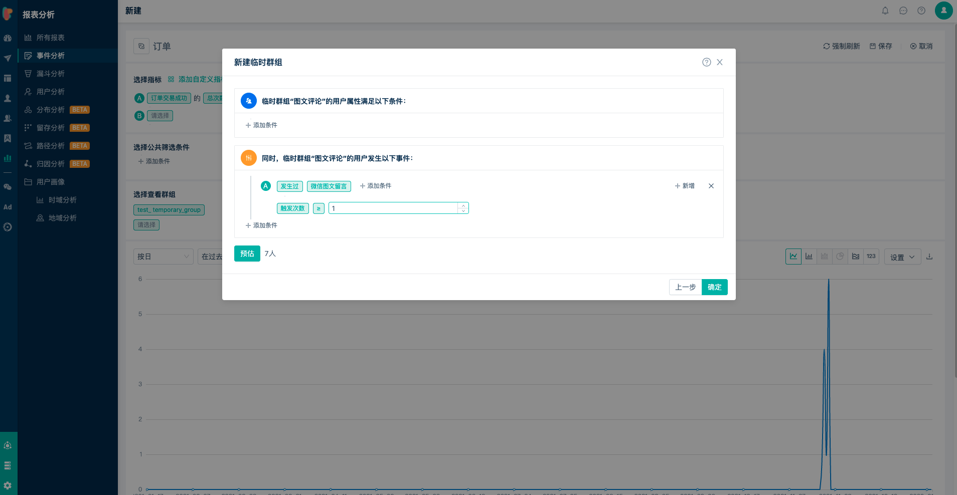 在事件分析、漏斗分析、用户分析、留存分析、路径分析中支持临时群组的使用