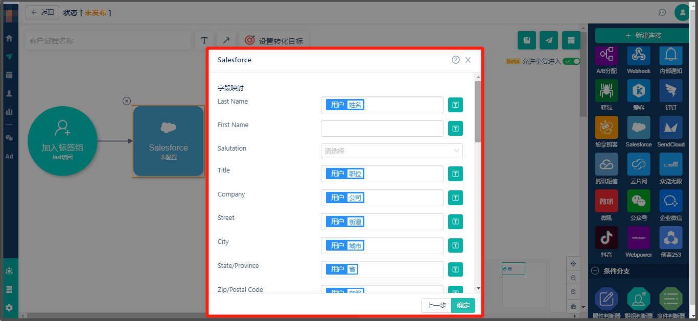 Salesforce动作支持将Linkflow联系人创建成为Salesforce的联系人,具体操作如下: