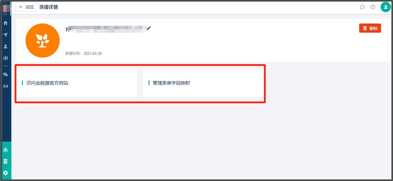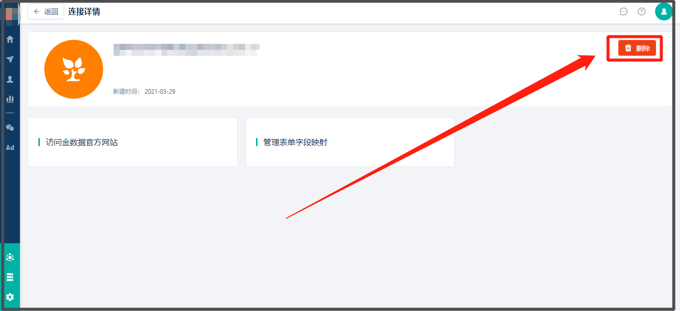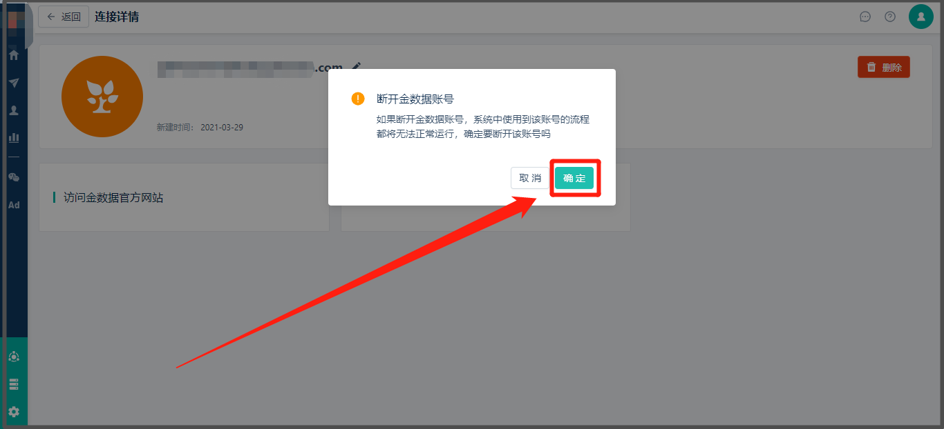 * 1. 点击需解绑[金数据](https://jinshuju.net/home)右侧操作栏中的“删除”按钮,系统弹框显示解绑说明