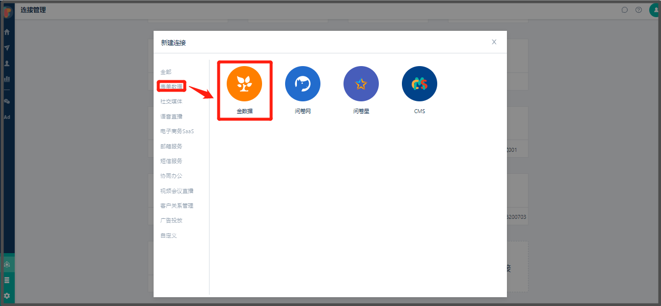 * 1. 路径:【连接管理】>【创建连接】,点击金数据图标按钮按钮,弹出金数据授权页面: