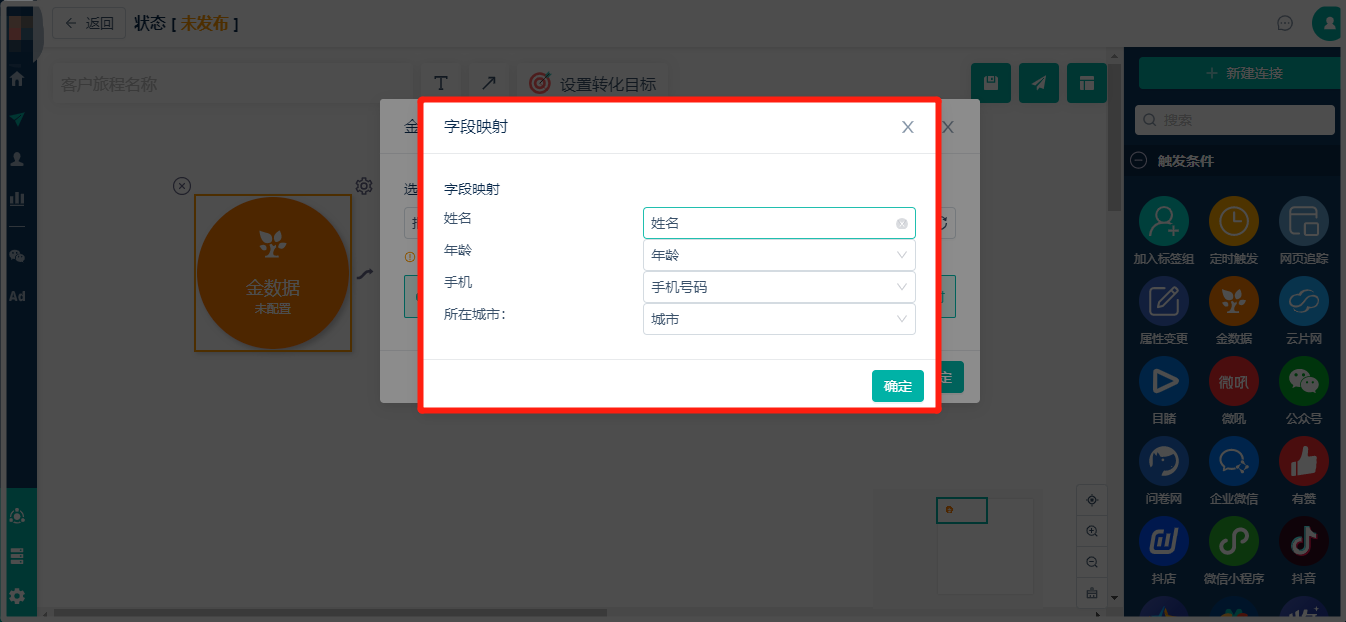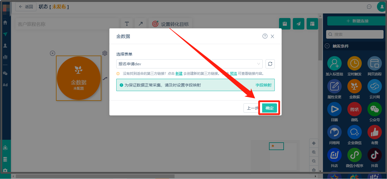 * 如果在微信环境下,即使不配置【金数据-触发条件】表单字段映射,当已经导入Linkflow的微信粉丝提交了金数据表单时,Linkflow依旧可以记录到粉丝的提交事件,此场景适用于不需要收集表单信息,只想知道谁提交了表单。