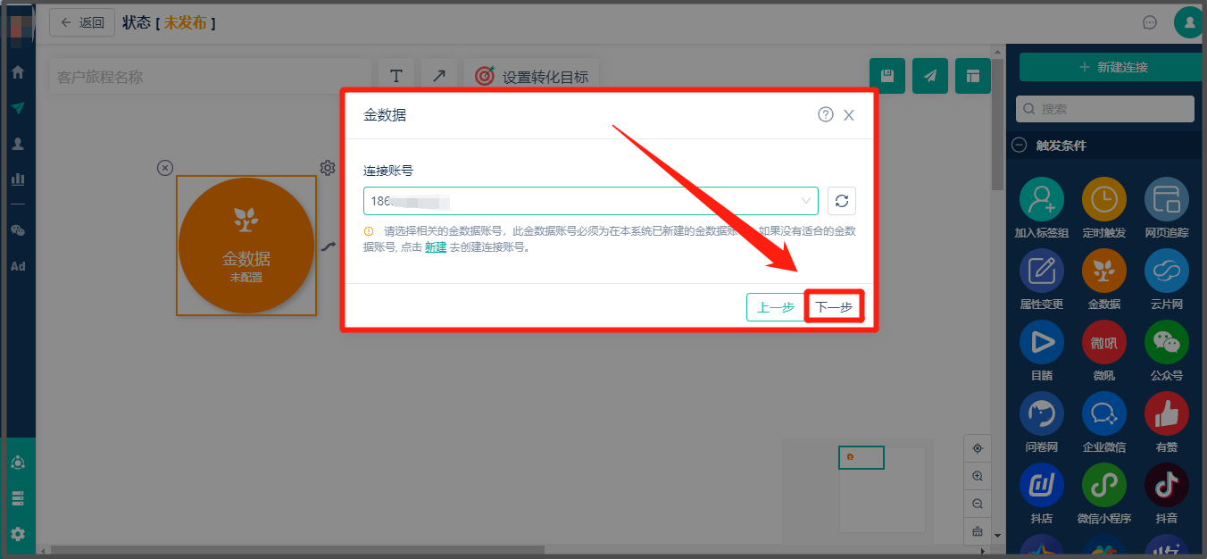 * 路径:【客户旅程】-点击左上方的“创建客户旅程”——点击“直接创建客户旅程”——找到“金数据-触发条件”: