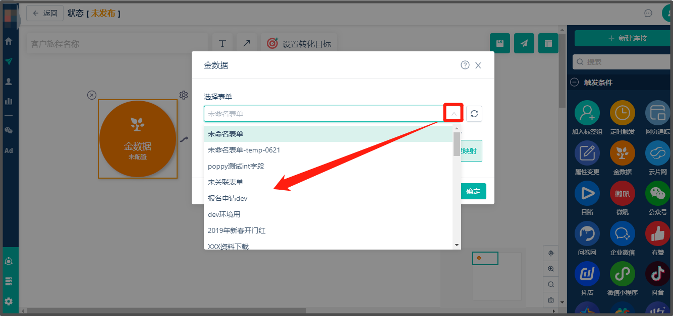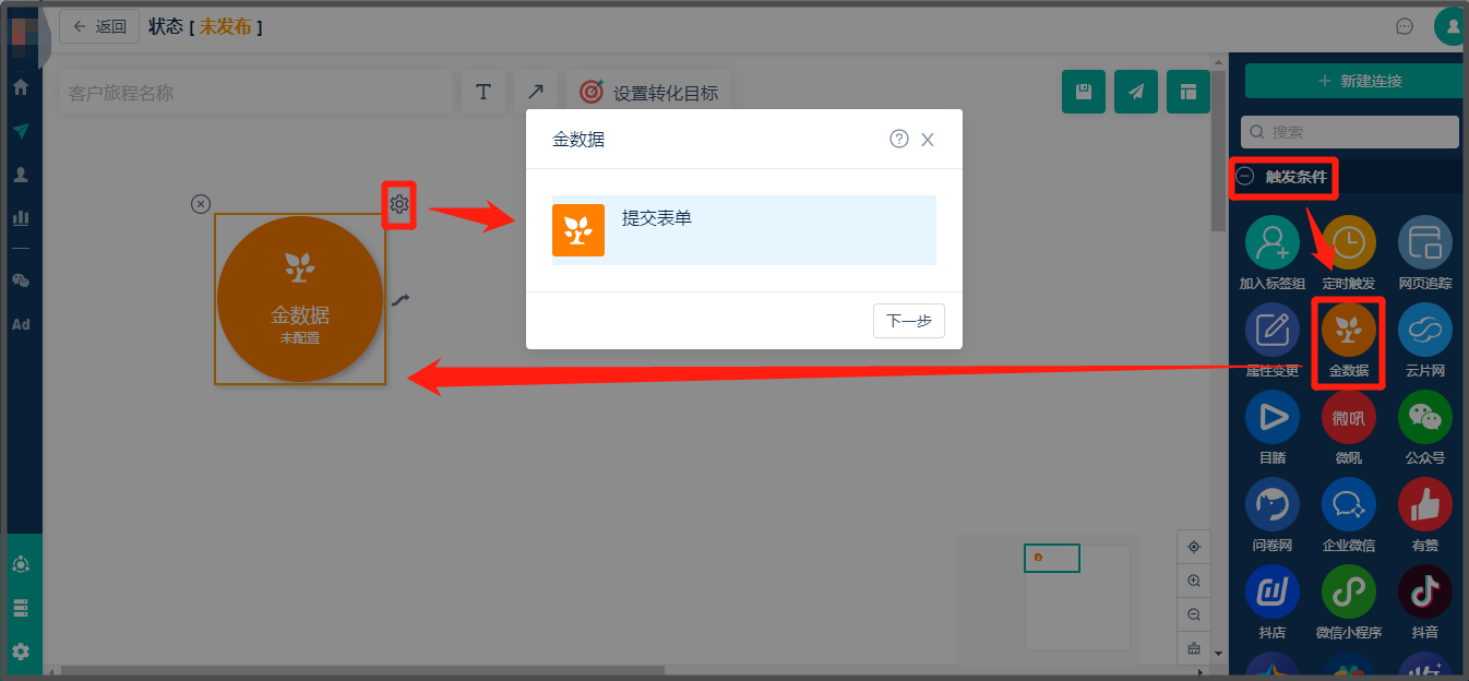 * 【金数据-触发条件】是指联系人完成指定金数据事件,如提交表单,则触发某个特定旅程。