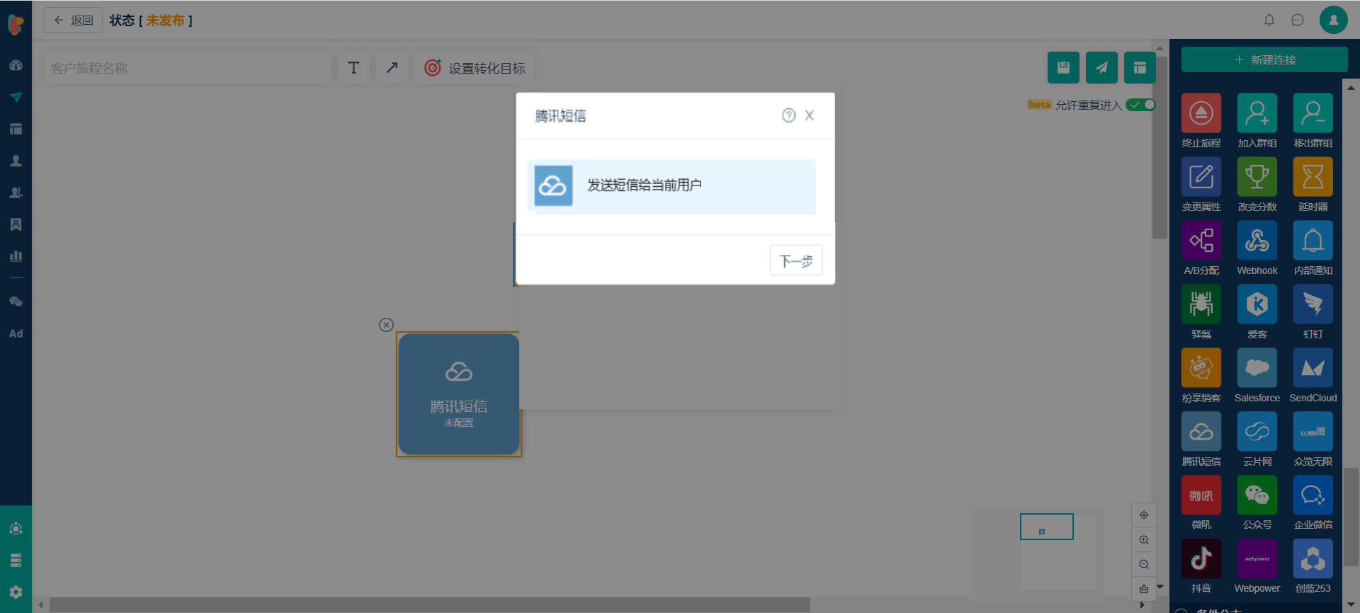 * 路径:【客户旅程】>【新建客户旅程】>【新建空白客户旅程】>选择【定时触发器】+【腾讯短信-执行动作】