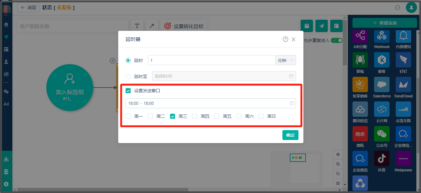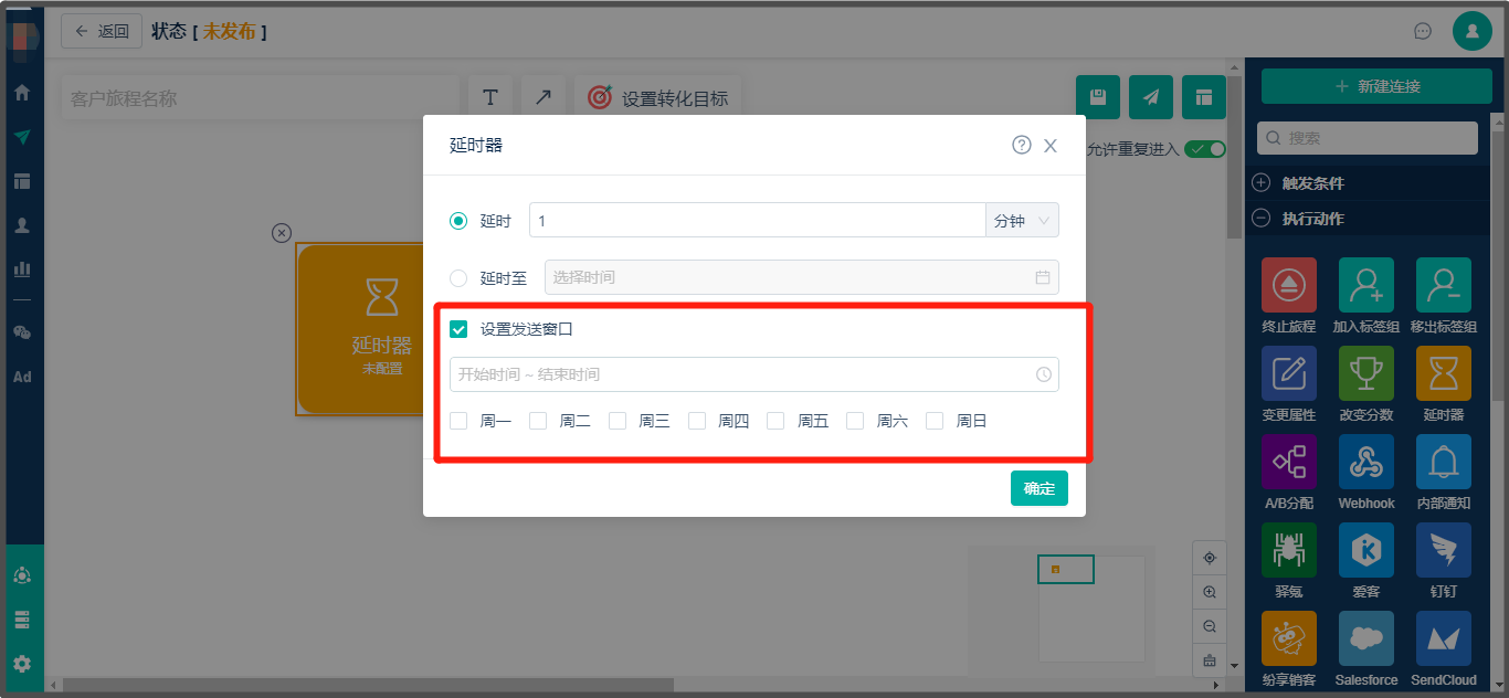 2. 如果延时器在周二选择延时1分钟,且发送窗口选择周三17点发送(非当天),那么在本周三17点会准时执行。(设置发送窗口选择为周二后的天数:周三~周日,那么在本周生效,反之,则为下周生效)
