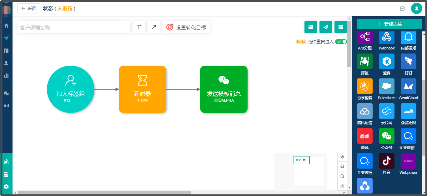如对[加入标签组](https://help.linkflowtech.com/lfcs/977766)的联系人延时1分钟发送微信模板信息,并且设定,每周三再次发送。