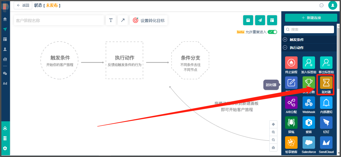 * 路径:【客户旅程】-点击右上角【创建客户旅程】-右方的【执行动作】中选择【延时器】