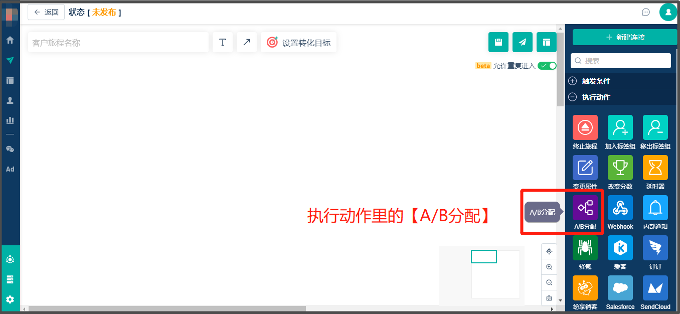 * 【AB分配】动作组件将进入客户旅程的联系人随机分成两个指定比例分别进入两个不同的旅程路径。