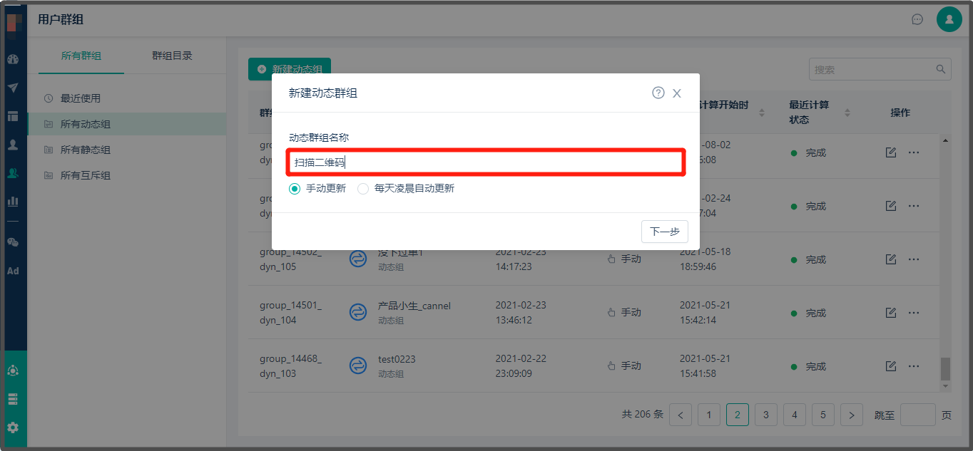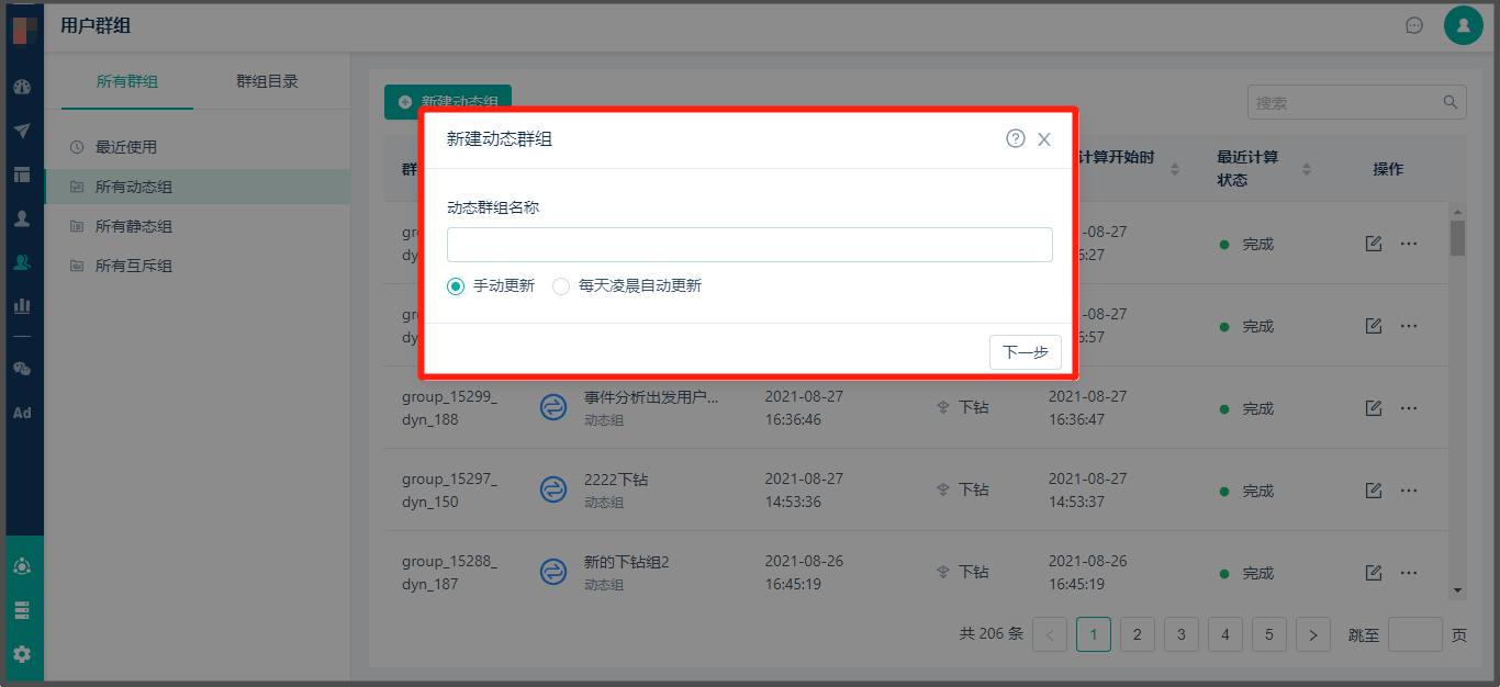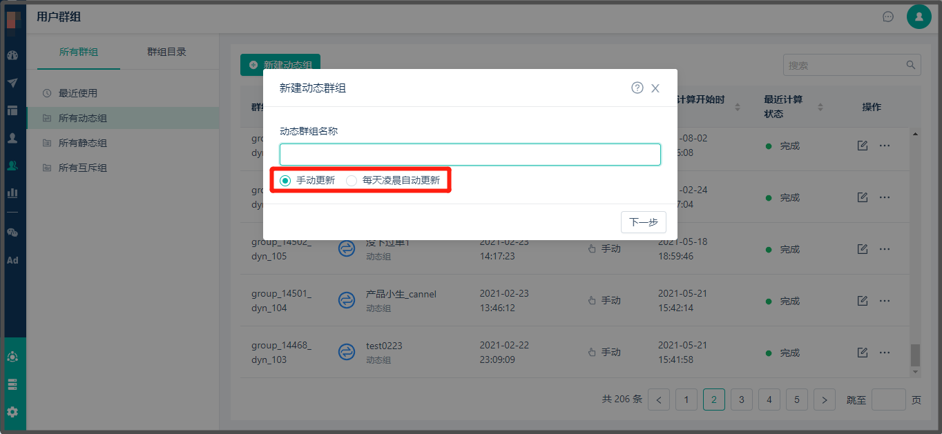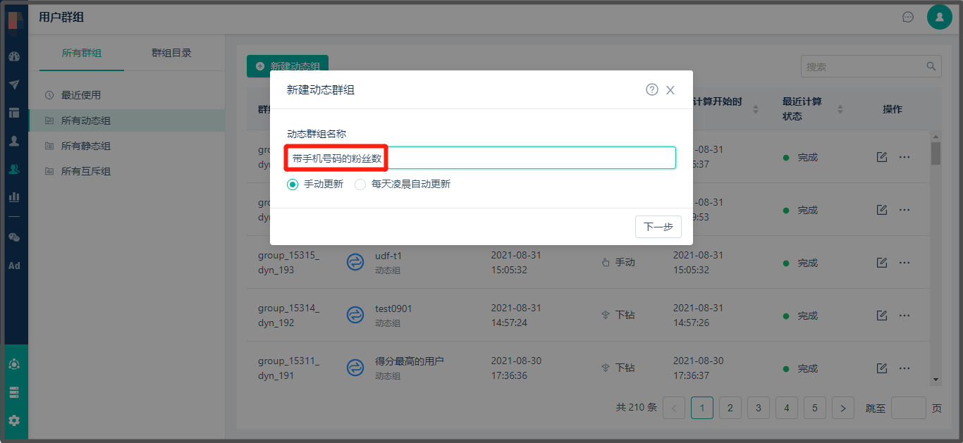 * 如选择【每天凌晨自动更新】,每天凌晨后动态标签组数据会更新完毕。