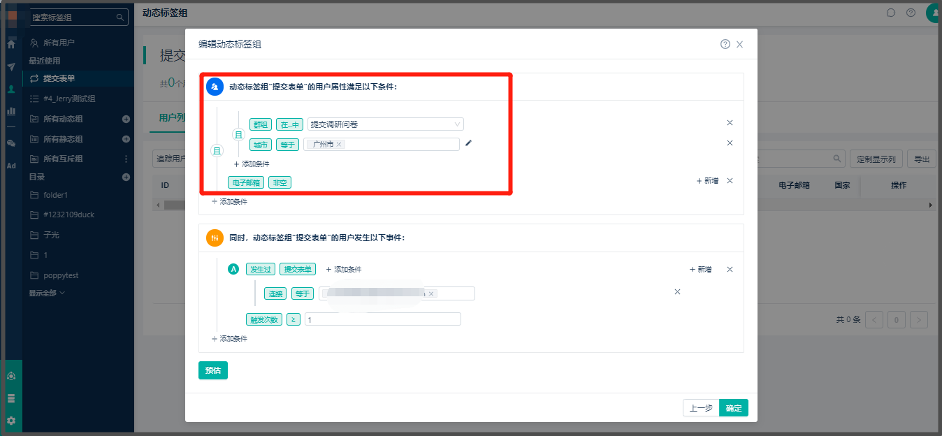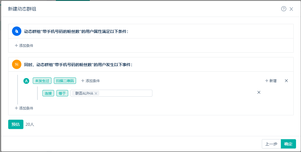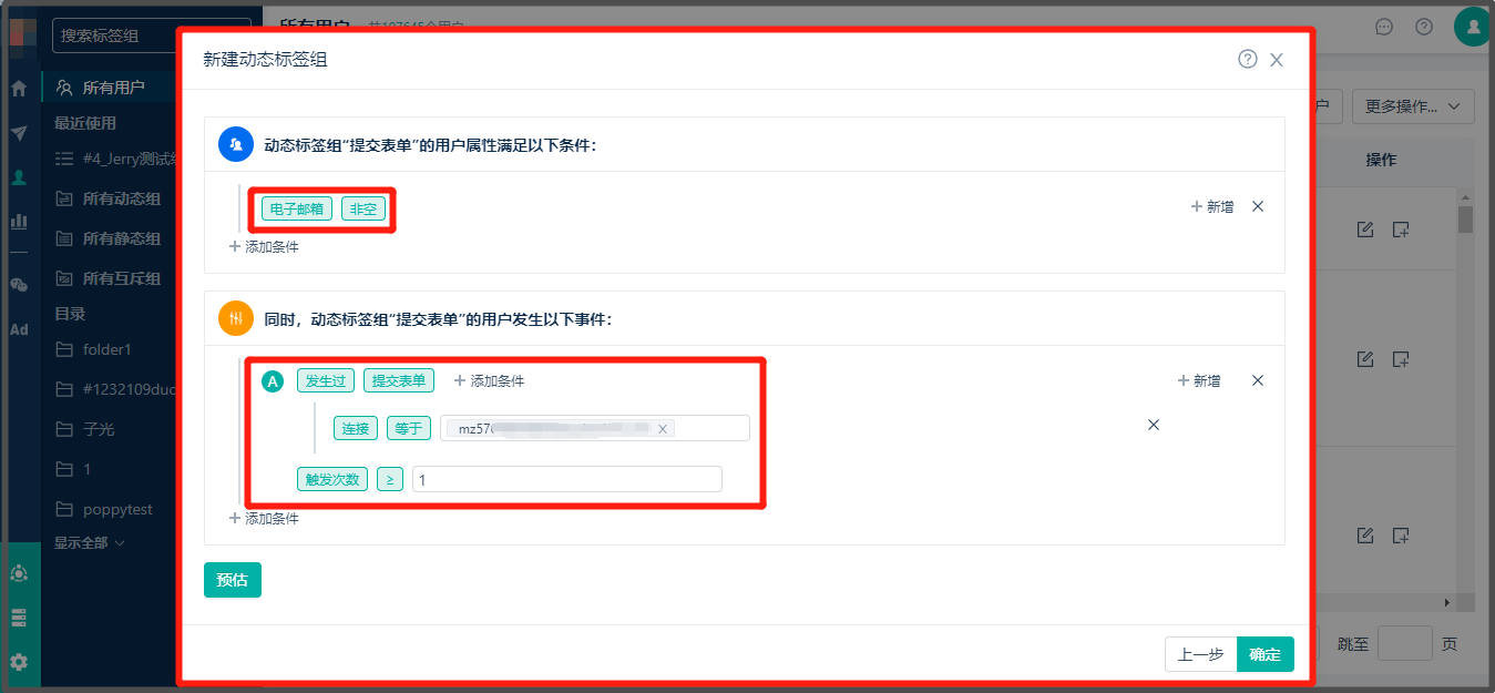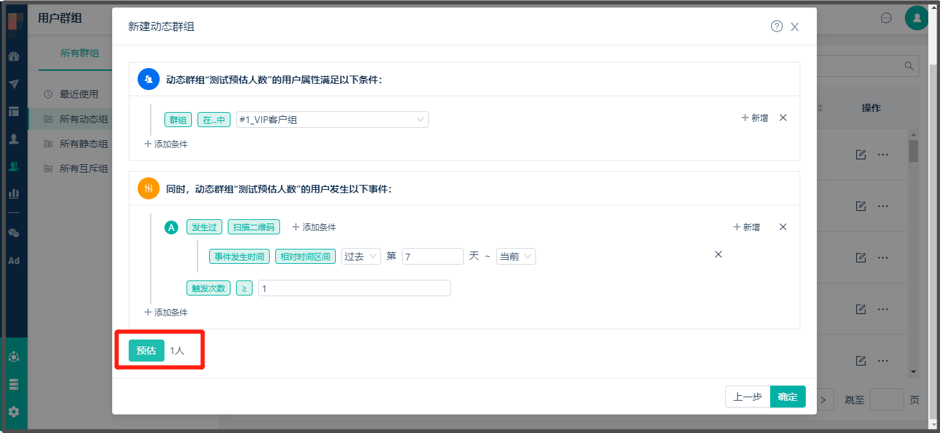 * 配置规则确认无误后,可以点击预估,可以预估到满足此条件的用户数,如下图:
